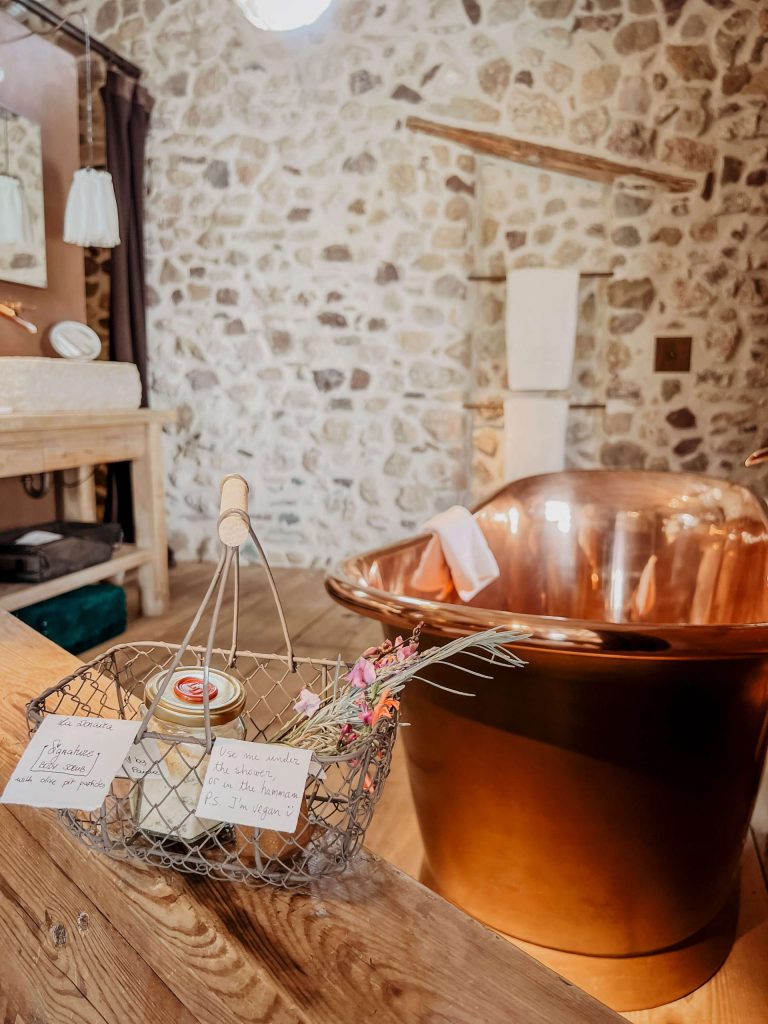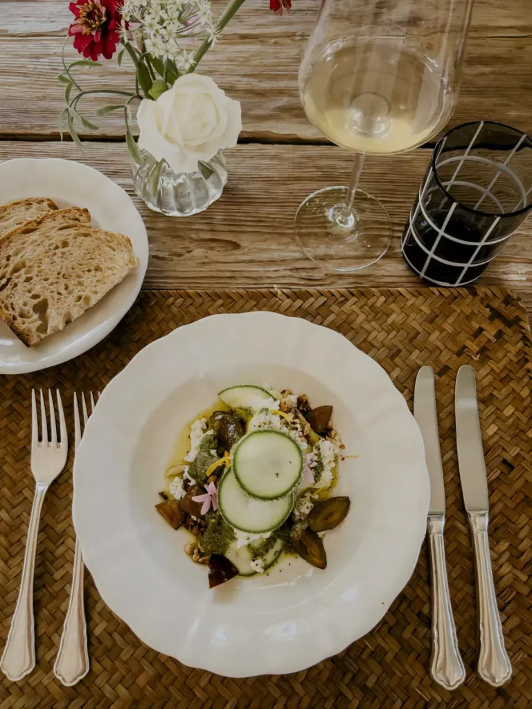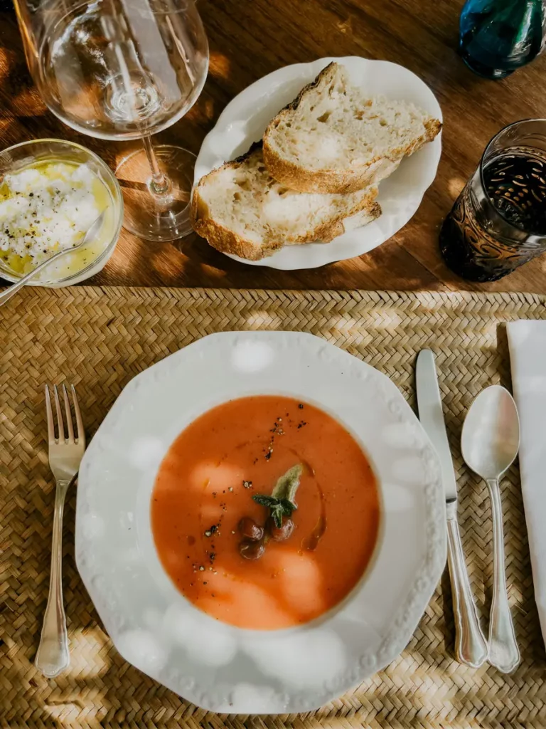 Während die Kinder frische Feigen aus dem Obstgarten genießen, plaudern wir mit Fabienne und schauen den Köchen zu. Wir fühlen uns, als wären wir zu Besuch bei meiner Lieblingstante, und im selben Augenblick erwachen die Erinnerungen an Kindheitstage in Omas Küche mit ihren dampfenden Töpfen und Pfannen, während sich die lieblichen Aromen in meiner Nase mit dem wohligen Schlückchen Wein im Gaumen vereinen. Denn auch das Essen ist sehr familiär – gegessen wird, wie bei Oma, was auf den Tisch kommt, mit dem Unterschied, dass die Menüfolge auf wunderschönem Büttenpapier nachzulesen ist. Aber keine Sorge, auf Wünsche und Allergien wird natürlich geachtet.