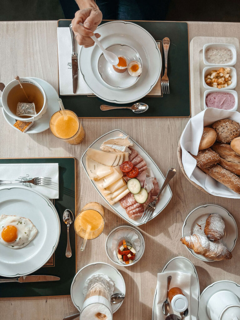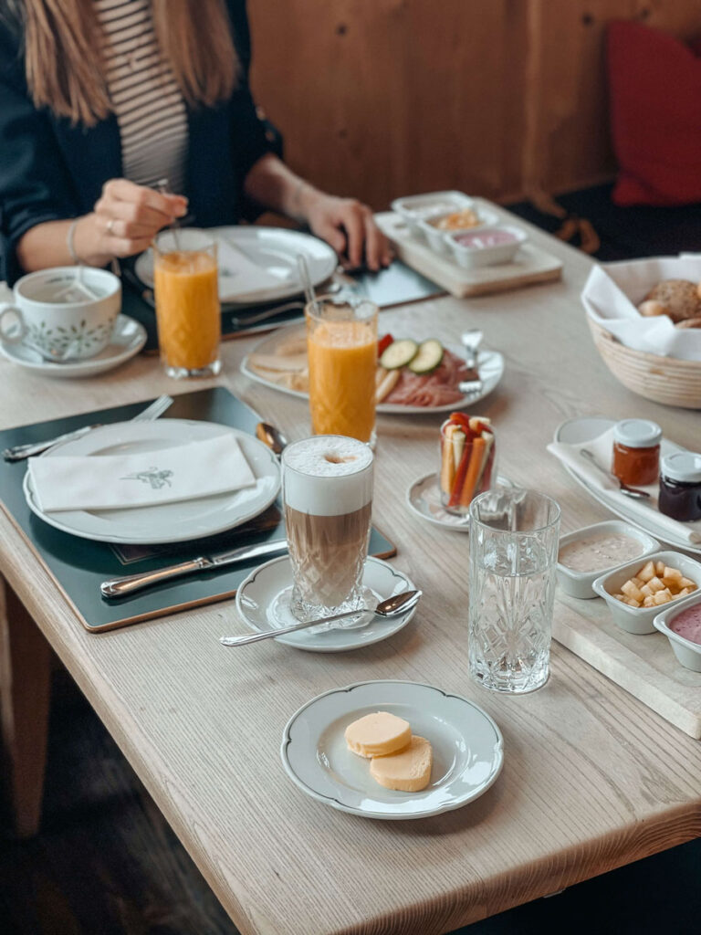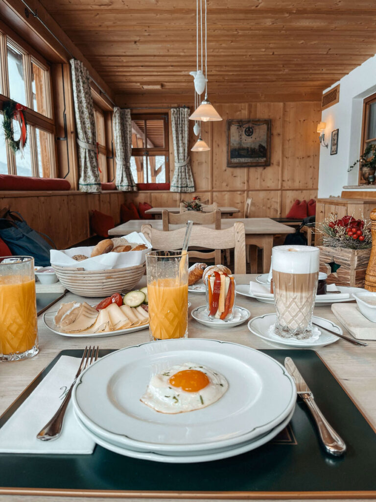 Der nächste Morgen lockt uns mit Sonnenstrahlen auf weißer Winterpracht aus dem Bett. Wir nehmen ein paar tiefe Atemzüge und genießen den Blick auf der Terrasse, bevor wir dem Duft des Frühstücks folgen. Es wird auf der lichtdurchfluteten Veranda kredenzt, von der wir zum köstlichen Kaffee und Tee das gesamte Tal im Blick haben. Erneut fehlt es uns an nichts: Käse, Schinken und Aufstriche, Getreidebrei und Fruchtmus, frisches Gebäck und Croissants. Und dazu jedes erdenkliche Gericht, das sich aus Eiern zaubern lässt. Ein gutes Gefühl, zu wissen, dass das Gute auf den Tellern für den unverfälschten und respektvollen Umgang mit der Natur und den Menschen steht.