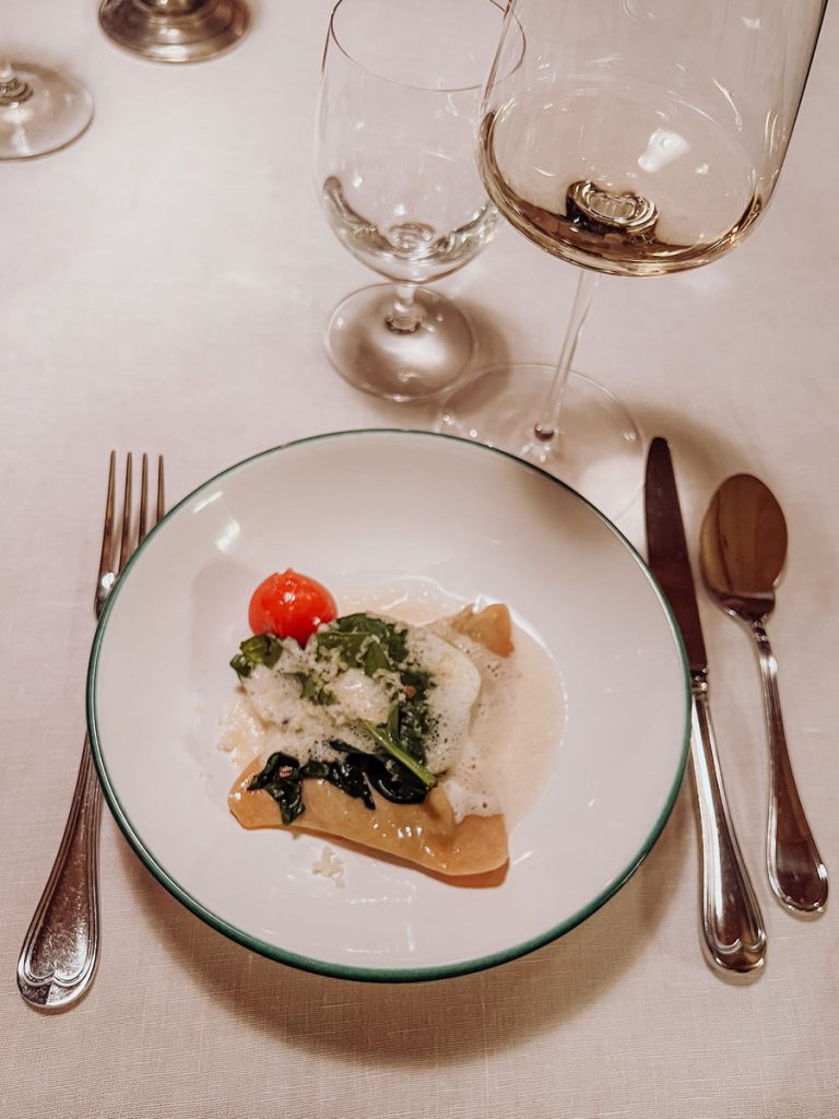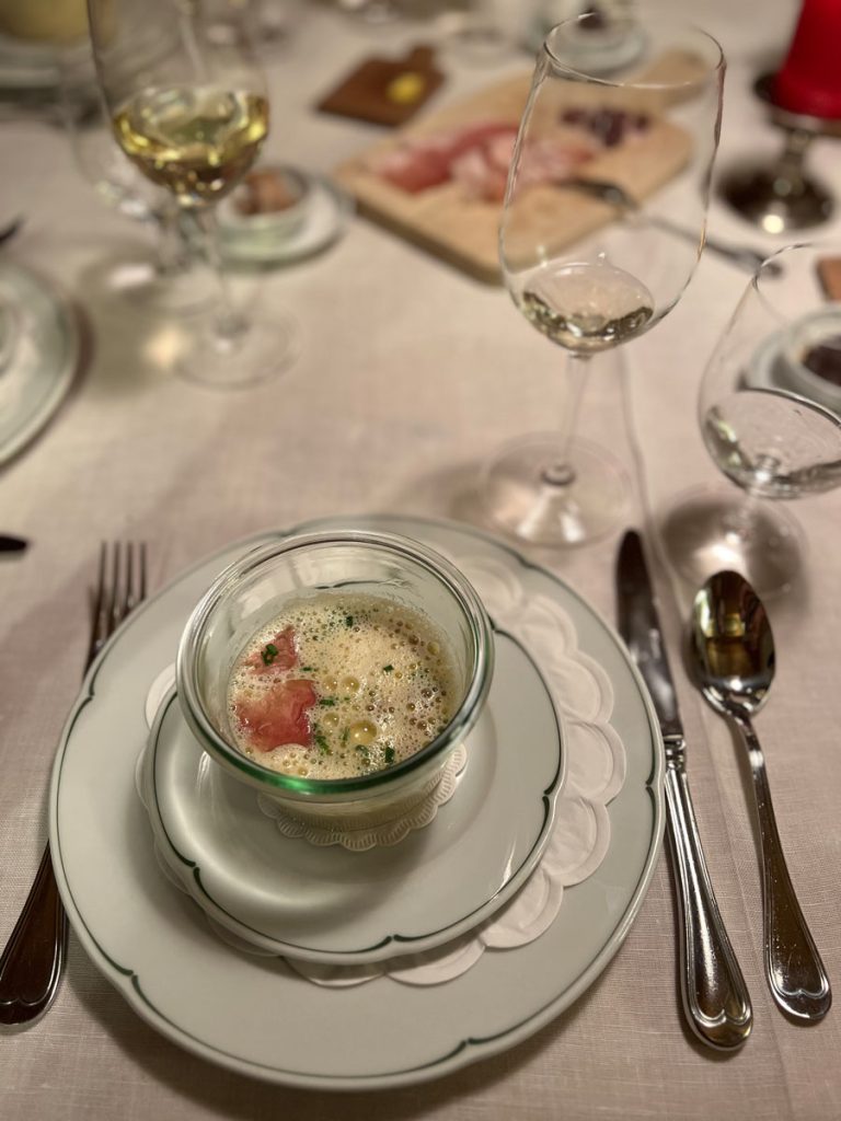Wir gehen zurück ins Gutshaus und finden uns zum Abendessen in der warmen Zirbenstube ein. Ein Raum mit Seele, der so wie der Sommelier (man muss ihn nur nach dem Jakobsweg fragen) viele Geschichten zu erzählen hat. Zum Auftakt wird das hausgemachte Brot mit Aufstrichen und Sauerrahmbutter gereicht. Wenn das Brot besonders würzig schmeckt, dann wurden die Laibe wahrscheinlich im alten Brotbackofen vor dem Haus gebacken. Das Geheimnis: Man schmeckt die ätherischen Öle des Reisig-Zweigs, mit dem die Glut aus dem Ofen gekehrt wird.
