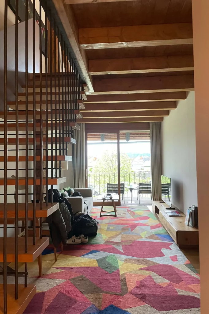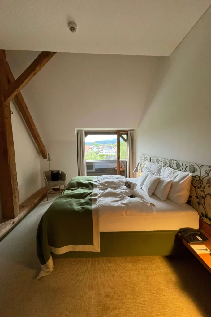 Unsere Unterkunft, einst das „Schlafgemach“ der Pferde, war eine Oase des Luxus und des Komforts auf zwei Etagen weit entfernt von Stall-Flair und Misthaufen. Trotz der modernen und stilvollen Einrichtung behielt die Suite den Charme des ehemaligen Stalls bei, was ihr eine besondere Atmosphäre verlieh. Die schrägen Wände und der Dachstuhl gaben der Suite eine wahre Gemütlichkeit. Ein liebevoller Willkommensbrief mit Programmvorschlägen und die beeindruckende Aussicht auf das Schloss und den Garten machten unseren ersten Eindruck perfekt.