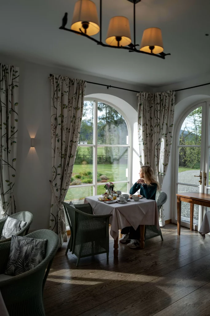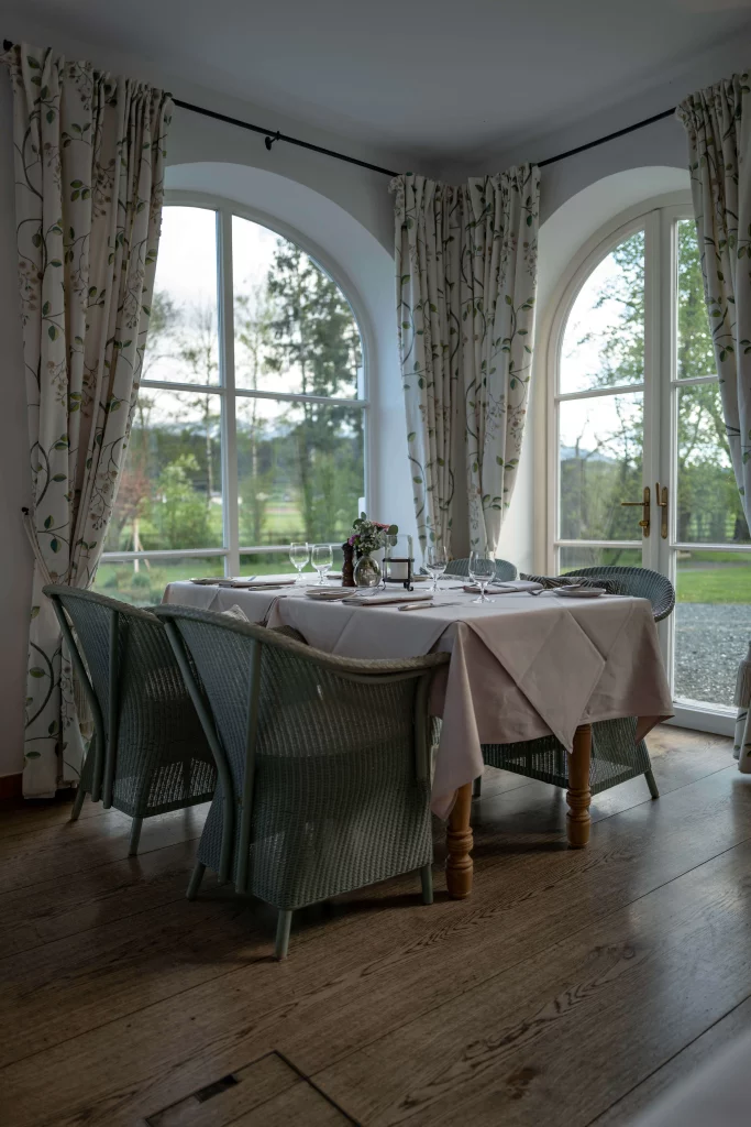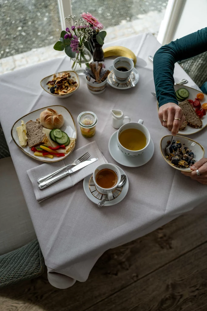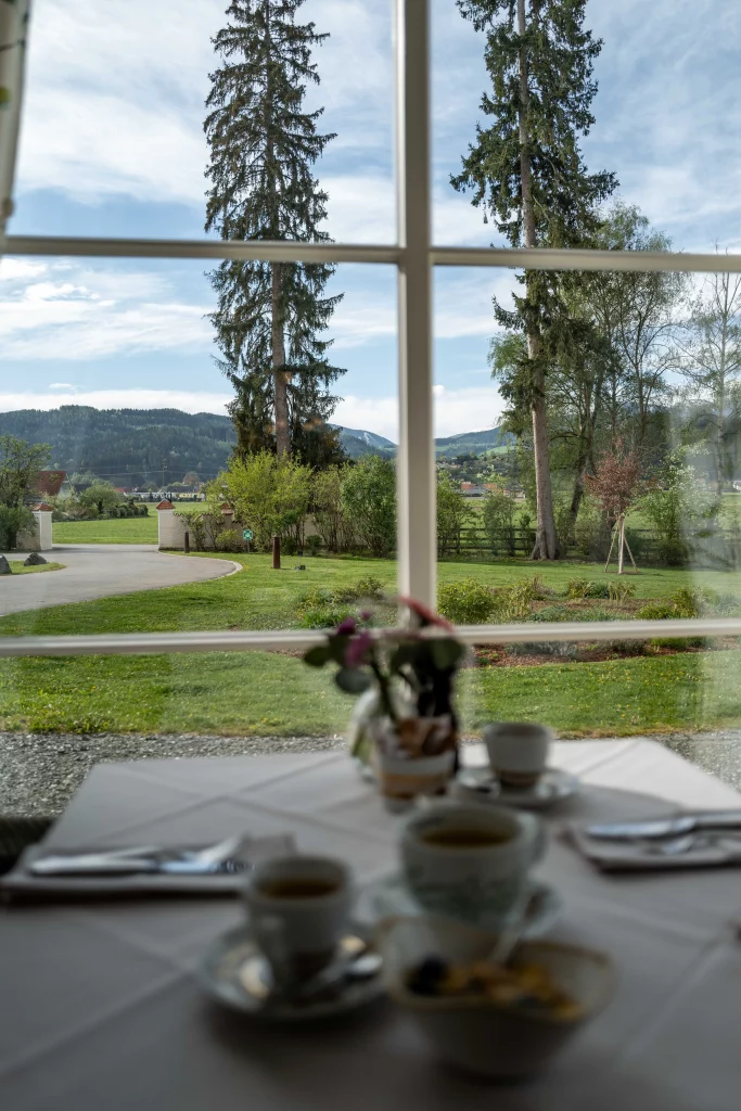 Nachdem wir am Abend unserer Ankunft mit heimischem Fisch und Schnitzel mit Fleisch vom Bauern noch ausgiebig und herrlich gespeist haben, hieß es für uns am nächsten Morgen „Bewegung“! Wir schnürten unsere Laufschuhe und erkundeten die Umgebung. Die hügelige Landschaft und das weite Grün erinnern an die Weinberge der Toskana. Danach hieß es im Pool noch ein paar Längen ziehen und jetzt auf zum wohlverdienten Frühstück. Der Duft von Kaffee im sonnendurchfluteten Wintergarten und die Köstlichkeiten von Eiergerichten, über Birchermüsli, Obst und Gemüse waren ein kulinarisches Erlebnis. Alles, was das Herz begehrt in einem liebevollen kleinen Buffet zusammengestellt. Das Geschirr und die Leinenservietten passen perfekt zum Stil des Schlosses – kleine Details mit Charme.