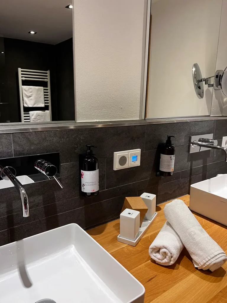 Nach der Jause dürfen wir unser Zimmer beziehen, die Family Deluxe Suite mit 2 separaten Zimmern. Perfekt für uns als Familie, so haben die Kinder ihr eigenes Reich mit einem Stockbett und wir unseres im Elternschlafzimmer mit Doppelbett. In diesem großzügig gestalteten Zimmer fühlen wir uns sofort wie Zuhause und die Suite bietet reichlich Platz, egal ob für einen Sommerurlaub oder einen Skiurlaub mit viel Gepäck der ganzen Bande mit Skianzügen, Schals, Skihelmen und Handschuhen.