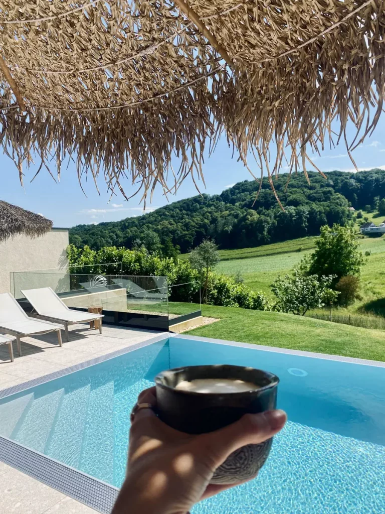 Gut geschlafen? Definitiv! Was für ein unglaublich tolles Wetter wir erwischt haben. Raus aus den Federn, Vorhang auf & wir lassen die ersten Sonnenstrahlen ins Bett scheinen. Besser könnte unser Tag nicht starten, als mit einem Floating brunch beim Pool, eine Schwimmrunde früh morgens und danach ein belebender Kaffee mit Bohnen einer umliegenden Rösterei. Erst war geplant, mit den E-Bikes des Hauses eine Runde zu drehen und die Umgebung zu erkunden. Doch der Wohlfühlfaktor unseres Farmhouses ist zu groß und so beschließen wir, den Nachmittag auf der Sonnenterrasse zu verbringen. Außer ein gutes Buch zu lesen, Sonne zu tanken, den Ausblick und das erfrischende Pool zu genießen, passiert hier heute nicht mehr viel.