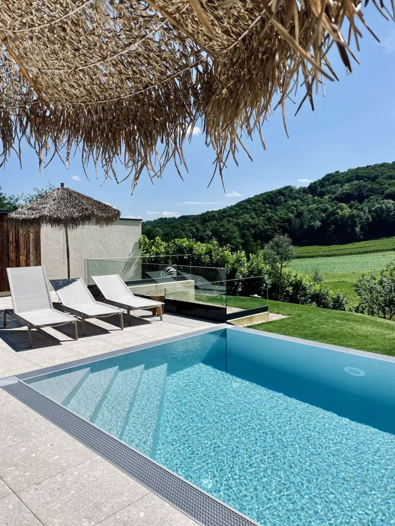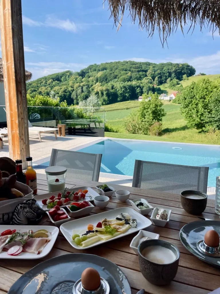 Liebevoll angerichtet wurde uns eine regionale Jause bereitgestellt, dazu ein erfrischendes Glas Rosé Frizzante – in diesem Haus weiß man, was herzliche Gastfreundschaft bedeuted. Wirklich an alles ist gedacht! Mit unserer Jause begeben wir uns in unseren ganz privaten Garten, der pure Genuss… Neben dem privaten Infinitypool, gemütlichen Liegen und einem großzügigen Garten, haben wir auch noch einen Whirlpool und einen eigenen Spa-Bereich mit Sauna. Alles mit Blick ins Grüne und auf die gegenüberliegenden Weinberge. Spätestens jetzt würde bei jedem von euch garantiert Urlaubsfeeling aufkommen, denn dieser Ausblick hier lässt unsere Seele baumeln.