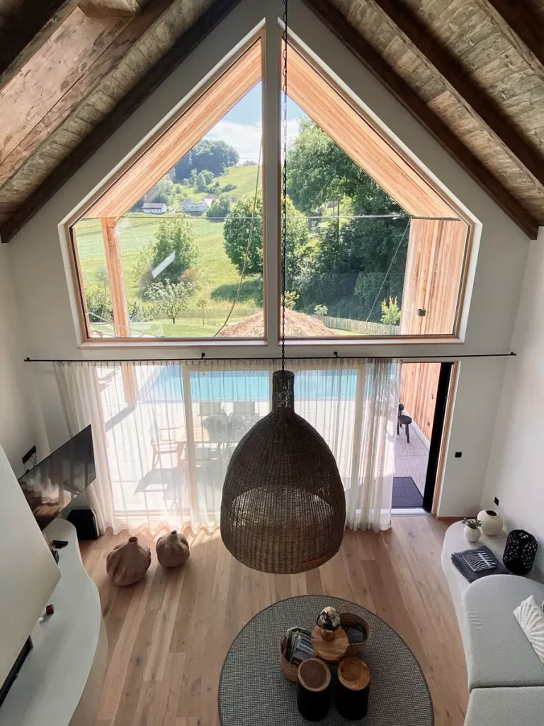 Das gesamte Design ist eine Handschrift und ist wirklich gelungen. „Südsteiermark meets Südafrika“ ist das Motto in den beiden Ferienhäusern des Julianhofs und das entdeckt man bis ins kleinste Detail. Sofort fällt uns die unglaubliche Raumhöhe auf, welche kombiniert mit der Glasfront ein besonderes Gefühl der Offenheit und trotzdem Gemütlichkeit aufkommen lässt. Viele Naturmaterialien, Holz und moderne Elemente wurden in dem Haus perfekt vereint. Die Wahl, welches der beiden Schlafzimmer wir beziehen, fällt uns gar nicht so leicht. Doch wir entscheiden uns für das im Obergeschoss mit freistehender Badewanne, Hängesessel und offenem Badezimmer. Ein Sprung in das himmlische Bett mit Aussicht auf das kleine, am Hügel erbaute Weindorf Straden und wir sind voll und ganz hier Angekommen. Einen Augenblick genießen wir es einfach hier zu sein. Doch schnell packt uns die Vorfreude, das restliche Haus zu erkunden.