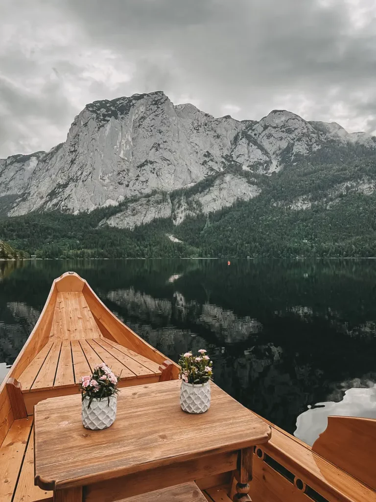 Nach dem Frühstück folgen wir der Empfehlung des Hauses und lassen uns mit einer Plätte, dem traditionellen Holzboot, über den See zur Seewiese bringen. Obwohl Altaussee ein bekannter Anziehungspunkt für viele Touristen ist, verliert der Ort nichts von seinem Charme. In nur 30 Minuten erreicht man die Anlegestelle in Altaussee von Pürgg aus mit dem Auto. Das gesamte Ausseerland, mit seinen einzigartigen Häusern und Traditionen, versprüht bereits bei der Anfahrt einen besonderen Zauber. Dank eines günstigen Wetterfensters gleiten wir beinahe alleine über den See und genießen diesen zauberhaften Moment.
