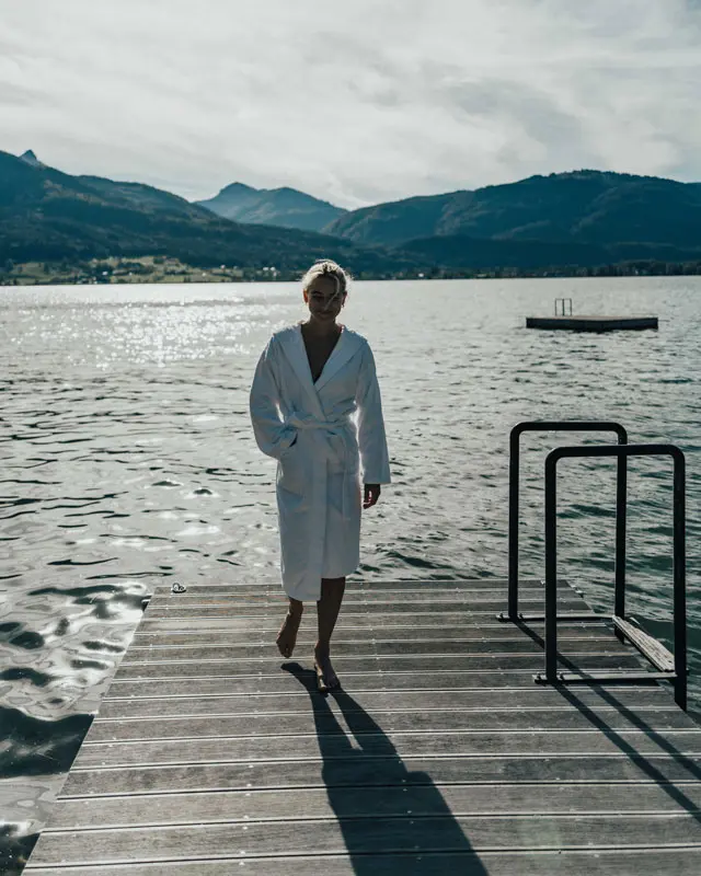 Nachdem wir uns etwas ausgeruht hatten, gönnten wir uns einen weiteren Besuch in der Sauna und wagten anschließend den Sprung in den Wolfgangsee. Es erforderte zwar etwas Mut und einen kräftigen Schubs, doch die erfrischende Kühle war ein wahrer Genuss! Zurück in unserem Zimmer, wo uns die Kälte doch etwas frösteln ließ, entschieden wir uns, die freistehende Badewanne zu testen. Ein Schaumbad wie im Film – einfach herrlich entspannend, besonders wenn man zu Hause keine Badewanne mehr hat. So entspannt und glücklich wie an diesem Abend, fiel es uns leicht, ein weiteres fantastisches Abendessen zu genießen – dieses Mal romantisch und zu zweit. Dieser Aufenthalt im Landhaus zu Appesbach war wirklich ein Volltreffer – und ich lächle noch immer, wenn ich daran zurückdenke.