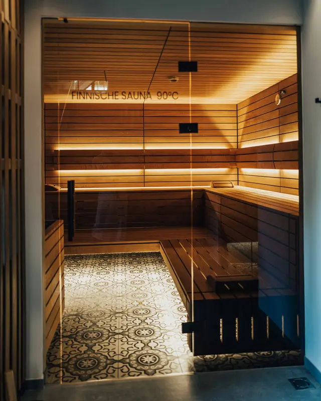 Doch bevor wir es uns im Zimmer gemütlich machten, ging es erstmal in den Wellnessbereich. Der Weg dorthin führte uns durch ein rustikales Treppenhaus, das an die Eleganz einer alten Herren-Villa erinnerte. Eine kleine, unscheinbare weiße Tür zwischen den anderen Zimmern verbarg den Zugang zur Wellness-Oase. Als wir die Tür öffneten, wurden wir von einem hellen, modernen Raum mit edlem Design empfangen. Der großzügige Ruheraum mit offenem Kamin und Dachfenster strahlte eine einladende Gemütlichkeit aus. Ich stellte mir vor, wie schön es hier bei Schneefall sein würde!