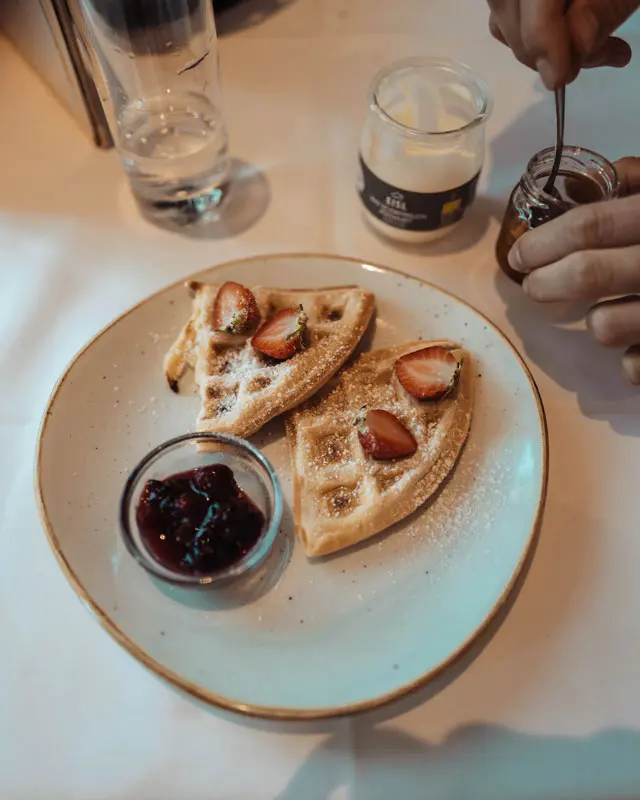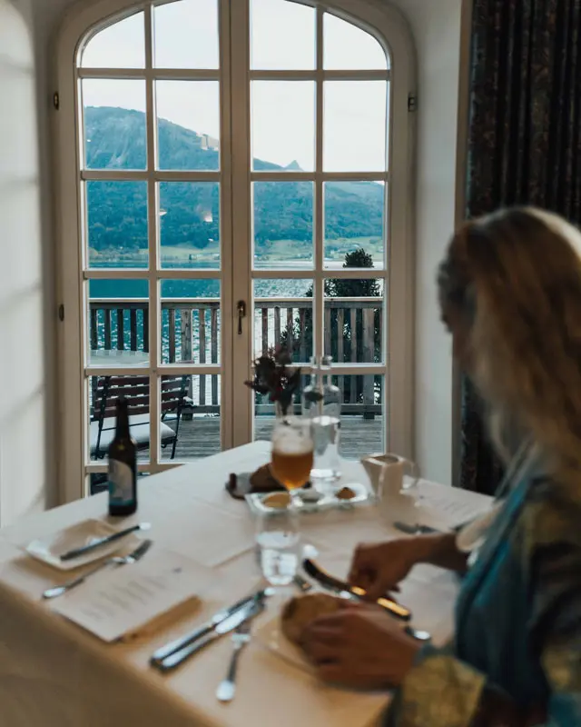 Nach einer erholsamen Nacht wurden wir am nächsten Morgen von einem glitzernden Blick auf den Wolfgangsee geweckt. Der Sonnenaufgang verwandelte die Wasseroberfläche in ein funkelndes Meer. Eilig zogen wir uns an und machten uns auf den Weg zur Bootsanlegestelle, um die frische Morgenluft und die wunderschöne Aussicht zu genießen, bevor wir zum Frühstück gingen. Ein liebevoll angerichtetes Etagere, reichlich Auswahl von einem kleinen Buffet, sowie ein zusätzliches Menü mit Beef Tatar, Waffeln, pochierten Eiern, Lachsbrötchen und vieles mehr setzten das I-Tüpfelchen. All unsere Sonderwünsche wurden uns erfüllt und es blieb wirklich nichts offen – ein wahrer Genussmoment für uns Frühstücksliebhaber. Gut gestärkt schnürten wir unsere Wanderschuhe und machten uns auf zum Vormauerstein, einem Berg direkt hinter dem Landhaus. Der Ausblick von oben war schlicht unbezahlbar: sowohl der Wolfgangsee als auch der Traunsee erstrecken sich vor einem in ihrer ganzen Pracht.