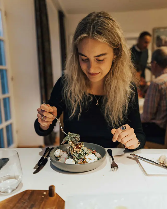 Das Abendessen genossen wir im Kreise der Familie, die uns im Landhaus besuchte und es gibt nicht viel mehr zu sagen als einfach „herrlich“… Das Essen war ein wahres Fest für die Sinne, zubereitet aus heimischen Produkten: Sauerteigbrot, Wolfgangseer Schafskäse, knackiger Salat und frischer Fisch aus der Region – alles harmonisch aufeinander abgestimmt. Wir verbrachten einen unvergesslichen Abend im liebevoll gestalteten Speisesaal, der an einen Wintergarten erinnerte. Der zuvorkommende Service rundete das Erlebnis mit Witz und Charme ab.
