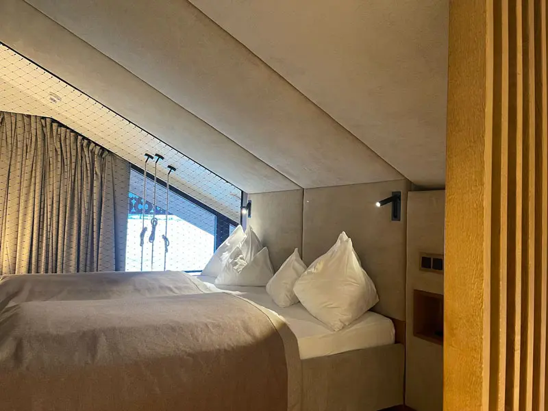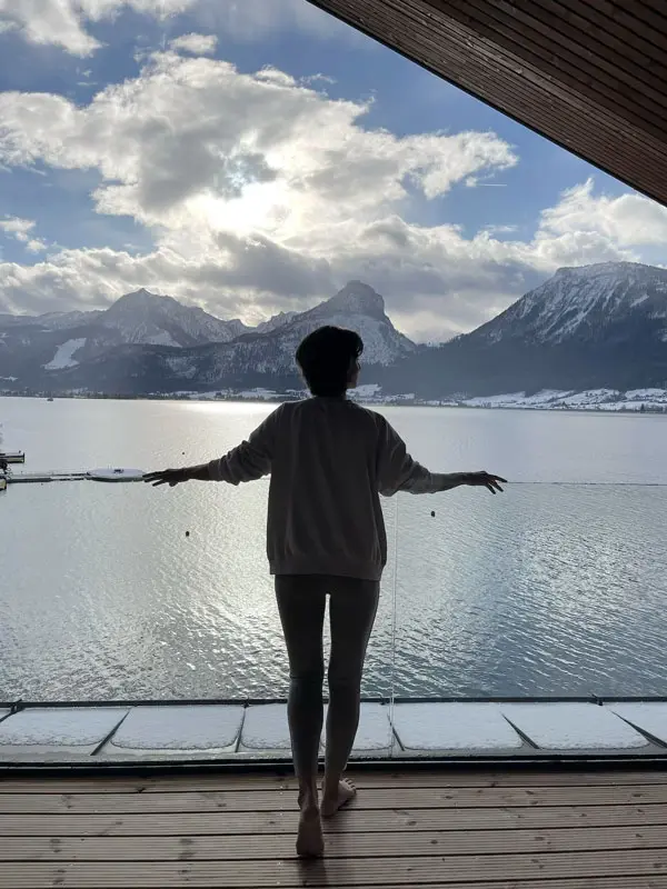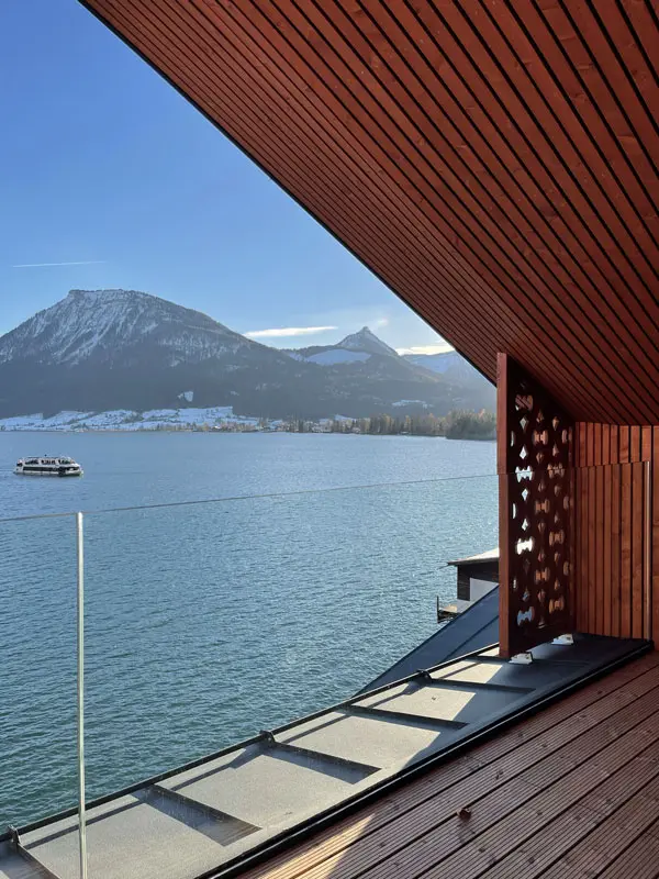 Wir nehmen die Zimmerkarte entgegen und steigen mit unseren Trolleys in den Aufzug. Das „See Nest“ auf der vierten Etage wird für die nächsten zwei Nächte unser Zuhause sein. Gleich nach dem Öffnen der Türe entfaltet sich hinter großen Fenstern der winterliche Charme des Wolfgangsees! Wir staunen über den weiten Ausblick. Sogar das Balkongeländer ist aus Glas und lässt die Architektur auf magische Weise mit der Landschaft verschmelzen.