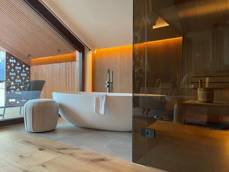 Nachdem wir dem See genug Aufmerksamkeit geschenkt haben, sehen wir uns weiter um. Eine freistehende Badewanne und eine eigene Sauna sind die unübersehbaren Highlights, die Wellness-Flair im eigenen Refugium versprechen. Auch von der Dusche und vom gemütlichen Sofa aus blickt man direkt auf den See. Über eine Treppe geht’s hinauf zur Galerie: Das Bett erweist sich als Namensgeber für die Suite und erinnert tatsächlich an ein gemütliches Nest.