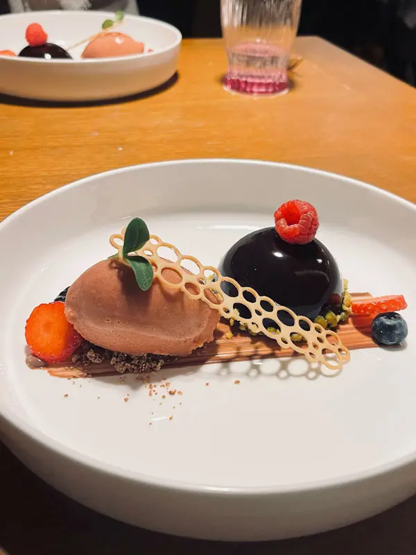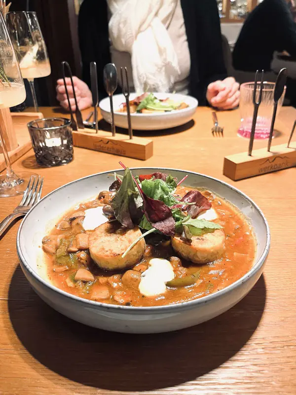 Wir bestellen den Aperitiv „Winter-Thyme“ mit Thymian und Orange und freuen uns auf das vegetarische Surprise-Dinner. Nach einem bunten Salat, wird ein Schwammerlgulasch kredenzt. Wir sind zwar satt, aber niemals würden wir uns das Dessert entgehen lassen. Inspiriert von den Zutaten der Mozartkugeln, sieht es nicht nur unwiderstehlich gut aus, es schmeckt auch so.