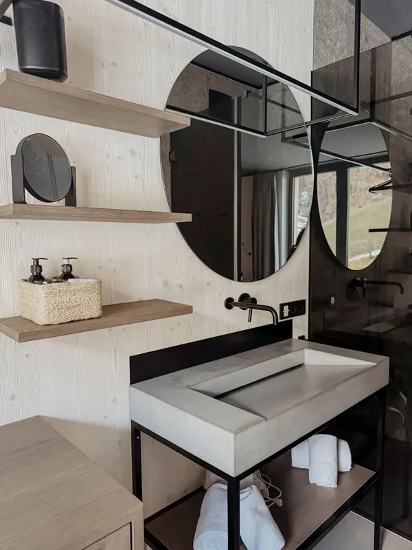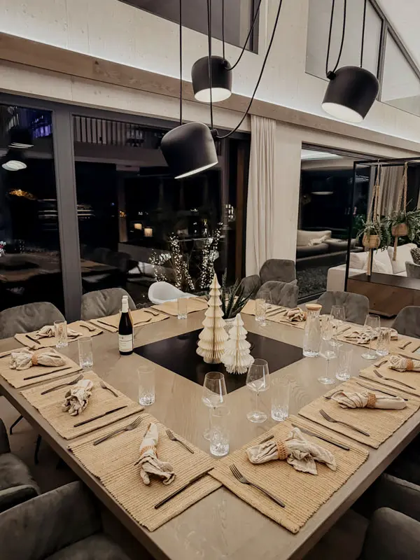 Ach ja, nicht zu vergessen: Wenn bei Anreise der Dorfladen in Dienten schon geschlossen ist, muss man nicht verhungern und verdursten. Auf Wunsch wird der Kühlschrank mit allem, was das Herz begehrt, gefüllt. In der Küche gibt es eine Eiswürfelmaschine, einen vollgefüllten Getränkeschrank, sogar Café und Tee sind persönlich gebrandet. Die Liebe zum Detail ist überall spür- und sichtbar. In unserer stylischen Küche fehlt es an nichts. Sie ist perfekt ausgestattet mit zwei Kühlschränken und zwei Geschirrspülern. So gibt es um den Abwasch keine Zankereien! 😉