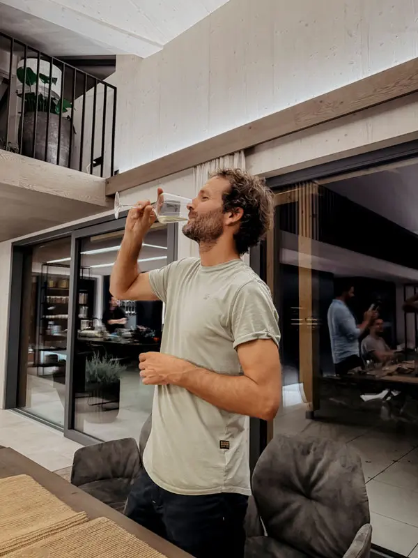 Auf einer kleinen Anhöhe liegt unser temporäres `home away from home`. Julia, die Gastgeberin, empfängt uns – mit berechtigtem Stolz – vor dem wunderschön errichteten Neubau gleich hinter dem Bauernhaus ihres Bruders. Heimatverbunden und bodenständig ist die Familie. Sie möchte den Hof für spätere Generationen erhalten und hat gemeinsam mit einem Architekten mit viel Liebe zum Detail und regionalen und nachhaltigen Materialien dieses außergewöhnliche Luxus-Feriendomizil errichten lassen. Es wirkt wie ein luxuriöses Privathaus und bietet bis zu 12 Personen Platz. Hohe Glasfronten eröffnen auf vier Etagen einen tollen Blick über das Tal hinüber zu einem kleinen Hügel mit einer Kirche.