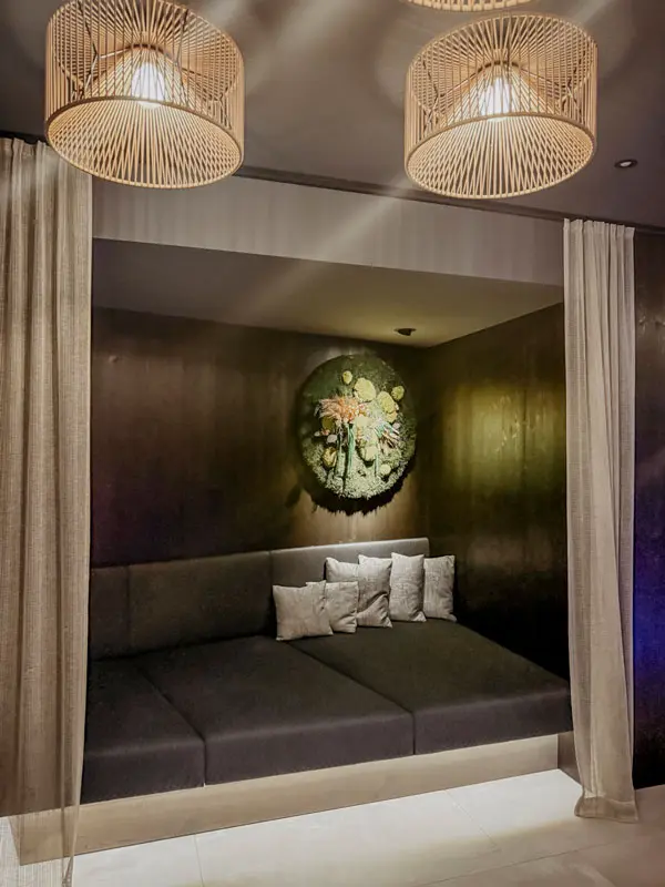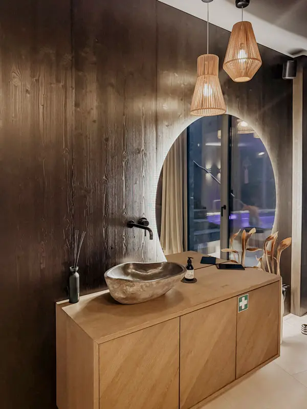 Auf der selben Ebene gibt es einen Indoor-Pool. Die Wände sind in einem beruhigenden Schwarz gehalten, das eine wohltuende Atmosphäre schafft, akzentuiert durch zwei stilvolle Echtmoos-Bilder. In den einladenden, gemütlichen Nischen fällt das Entspannen ganz leicht. Auf zwei Seiten öffnen Glaswände den Blick in die Außenwelt und laden dazu ein, die Umgebung auf sich wirken zu lassen. Von der angrenzenden Sauna sieht man auf das Kirchlein am Bichl rüber. Nach einer Schwitzsession geht’s direkt in den Garten hinaus in den wohltemperierten Jacuzzi.