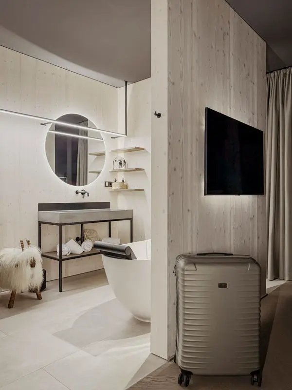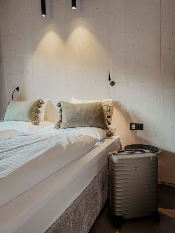 Schlicht und stilvoll, mit einem Hauch skandinavischem Flair, ist das Innenleben des Hauses. Die Wände sind mit weißgestrichenem Holz vertäfelt und geben den Räumen ein freundliches und behagliches Wohlfühl-Ambiente. Die Hausherren Julia und Bernhard haben überall wunderschöne Fotos eines befreundeten Fotografens aufgehängt. Sie verleihen dem Haus eine sehr persönliche Note. Sogar der Lift ist mit altem Holz und nostalgischen Fotos ausgekleidet – eine Hommage an frühere Zeiten. Die Inneneinrichtung ist geschmackvoll und trägt die warmherzige Handschrift der Familie. Gleich links im Eingangsbereich gibt es eine großzügige Garderobe mit Skiständer, um vor allem in der kalten Jahreszeit Klamotten und Ausrüstung gut unterzubringen. In der Mitte steht eine riesige Polsterbank, auf der man die Kinder bequem zum An- und Ausziehen hinsetzen kann. Im Winter kann man direkt von der Piste beim „Studio 963“ abschwingen!