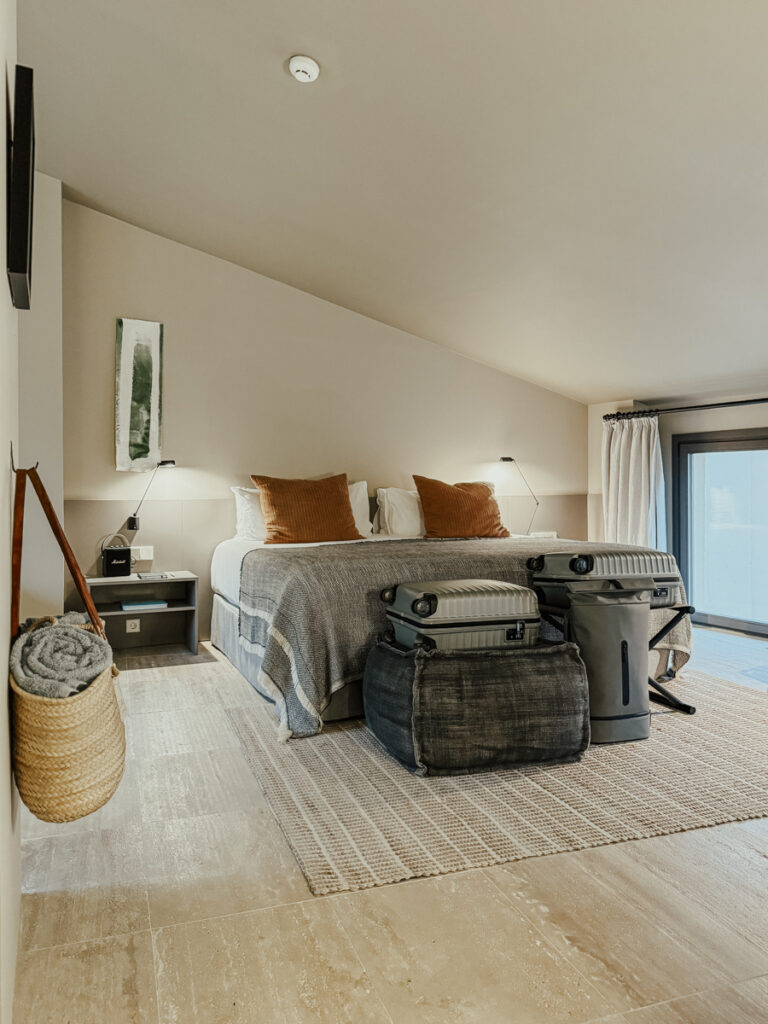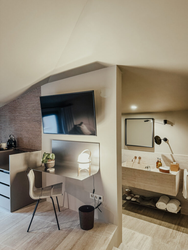 Zur Begrüßung gönnen wir uns eine entspannende Tasse Tee, bevor wir unsere Suite beziehen. Unser Glück liegt nur ein paar Stufen vom Eingangsbereich entfernt. Eine Wohlfühloase auf mehreren Ebenen erwartet uns hier: eine kleine private Terrasse, ein offen gestalteter Wohnbereich und stilvolles Design bis ins kleinste Detail ohne aufdringlich oder überladen zu sein – hier sind pure Eleganz und mallorquinischer Charme wunderbar miteinander vereint und bieten eine stimmige Symbiose.