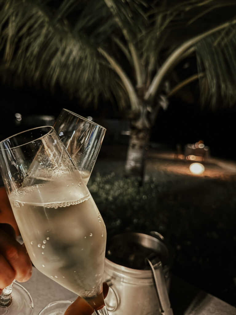 Alternativ gibt es unterschiedliche Wasservillen, die sich einen Holzsteg entlang, hinaus in die Lagune ziehen. Einige mit privatem Pool oder Jacuzzi, alle mit geräumigen Terrassen, direktem Zugang zum Wasser und scheinbar endlosem Blick auf den Ozean. Ich schalte mein Handy aus und schlüpfe aus meinen Schuhen … wusstet ihr, dass die Sonne den weißen Sand am Strand nicht aufheizt? Er besteht aus klitzekleinen Korallenstücken, für deren Entstehung der Papageienfisch verantwortlich ist. Somit können wir barfuß unsere Spuren im Sand hinterlassen.