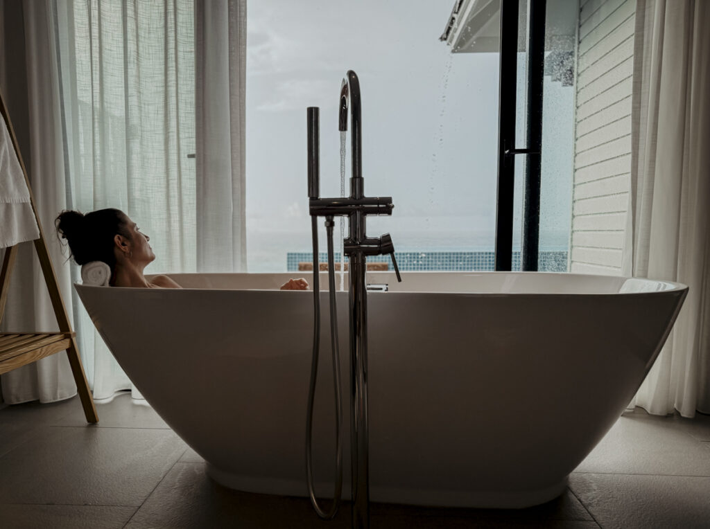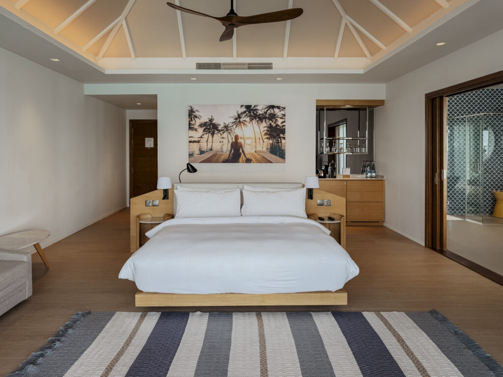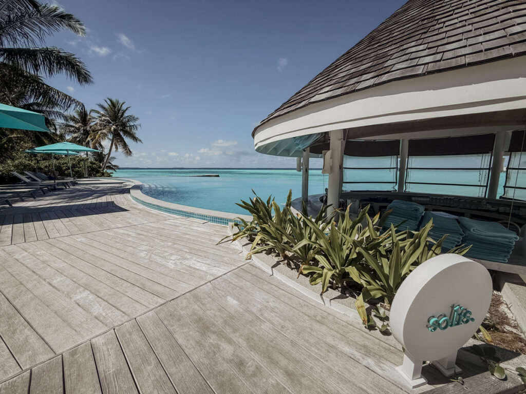 „Soulful Peace“, der Claim hier im Resort, wird auch im Spa-Bereich gelebt. Ruhig und friedlich ist die Atmosphäre hier. Empfangen werde ich in Dhivehi, der offiziellen Inselsprache, mit einem freundlichen „Assalaamu Alaikum“ und einem duftenden Blütentee. Richtung Ozean sind dann 6 lichtdurchflutete Overwater-Häuschen im Halbkreis angeordnet. In einem sind gleich zwei Liegen für ein Paarretreat, ein anderes hat eine freistehende Badewanne im Freien.
