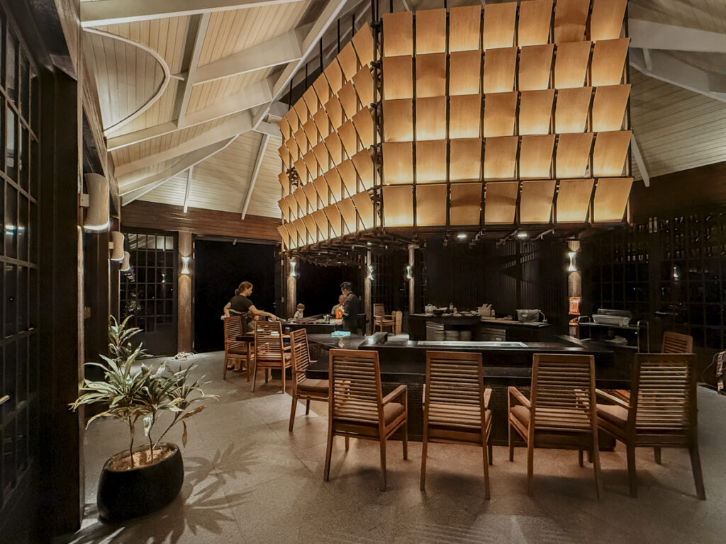 Natürlich wollen wir uns auch das Gourmet-Restaurant MIZU anschauen. Es thront auf Stelzen draußen am beleuchteten Steg über der Lagune. Allein der bezaubernde Atmosphäre wegen empfehle ich es unbedingt, auch wenn man dort extra bezahlen muss. Köstlichkeiten aus dem Meer, wie Oktopus, Muscheln, Tiger Prawns, aber auch herzhafte Steaks und heimisches Gemüse zaubert der Teppanyaki Koch vom Grill auf unsere Teller. Feurig geht es zu! Zum krönenden Abschluss bestellen wir Banana Flambé, serviert mit Kokoseis.