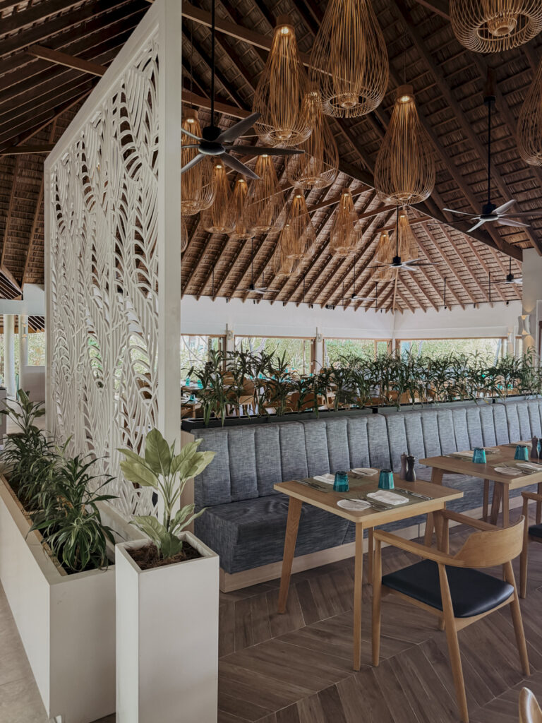 Unsere ersten drei Nächte verbringen wir in einer der Strandvillen auf der Ostseite der Insel. Schlicht und minimalistisch ist das Interieur, hell und fröhlich und mit der Schönheit der Insel im Einklang. Am Morgen küsst uns die aufgehende Sonne, am Nachmittag werfen die zahlreichen Palmen am Strand erste Schatten. Und wie endlos der Blick ist auf das Meer. Hier ist es zum hauseigenen Riff nicht weit und unsere Jungs lieben es, den Wasserflugzeugen beim Landen zuzusehen. Habt ihr schon mal im Freien unterm Sternenhimmel geduscht? Unbeschreiblich! Auf unserer Terrasse in der Hängeschaukel träumen, sich vom gut temperierten Meerwasser umspülen lassen und mit einem Kaffee in der Hand am puderweißen Strand in den Tag hineinstarten. Wie schön ist das Leben …
