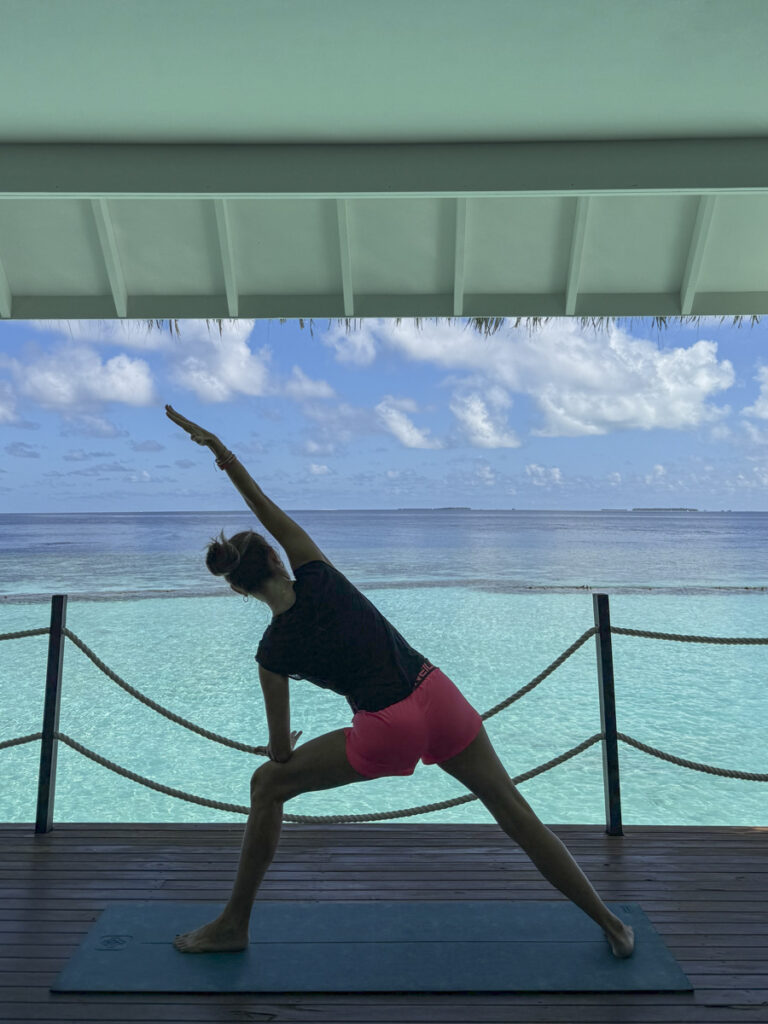 Bevor ich in einem der Häuschen ein bisschen Yoga mache, wird mir auf der Terrasse der Sand von den Füßen gewaschen. Aber das I-Tüpfelchen meines SPA Programms kommt jetzt: Während feinfühlige Hände meinen Körper kneten, kann ich (rein theoretisch … 😉 ) unter meiner Liege durch ein Glasfenster Haie beobachten!