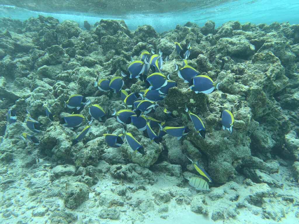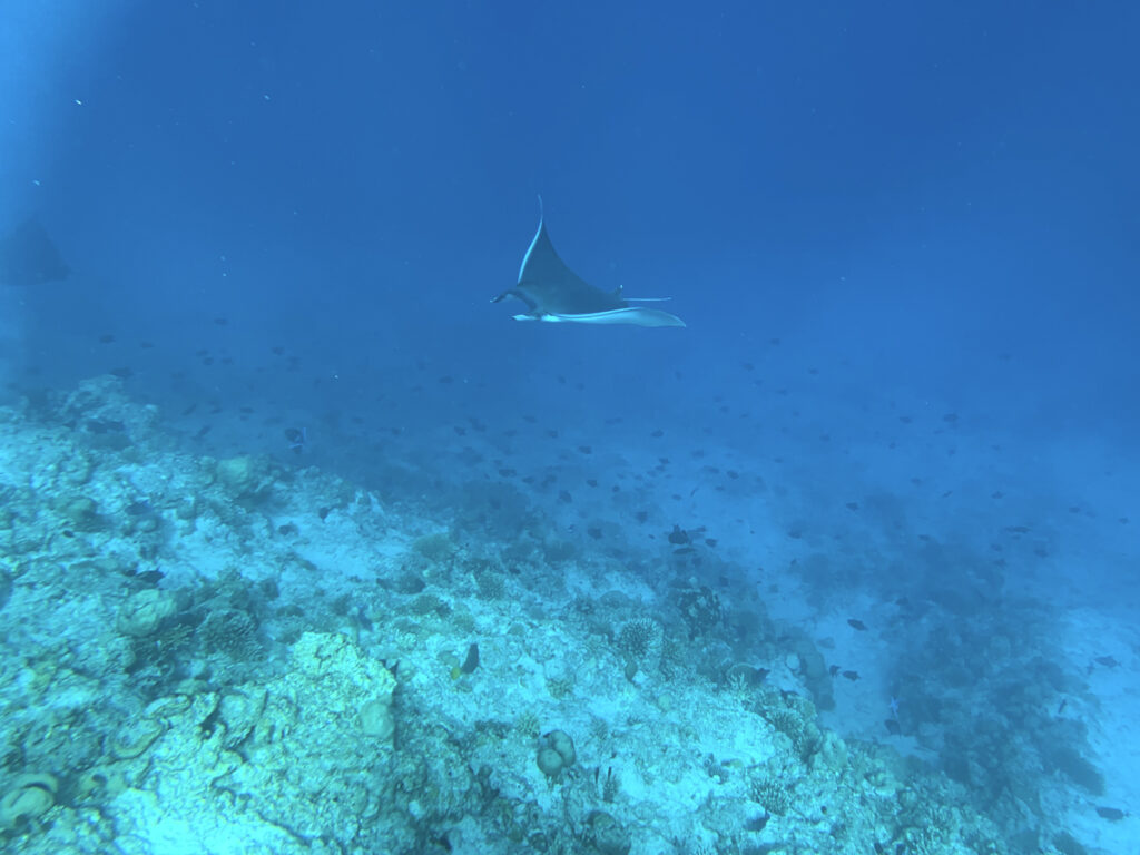 Das Hausriff, das die ganze Insel umgibt, ist eine Schatzkammer an farbenprächtiger Artenvielfalt und liegt direkt vor uns. Das Schöne, man braucht kein Boot, um die reiche Unterwasserwelt zu erkunden. Jeden Morgen, noch vor dem Frühstück, schnappen wir unsere Schnorchel Ausrüstung und tauchen ein in diese magische Welt: Weißspitzen-, Schwarzspitzen und Zitronenhaie, majestätische Mantarochen, scheue Meeresschildkröten und natürlich Scharen von bunten Fischen. Für alle, die unbedingt einmal mit einem Walhaie schwimmen möchten, ist die Insel Nova der perfekte Ausgangspunkt. Nicht einmal 20 Minuten mit dem Boot entfernt, besteht ganzjährig eine sehr hohe Chance, sich mit den sanften Riesen im lauwarmen indischen Ozean treiben zu lassen.