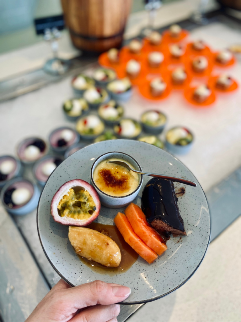 Zum Frühstück mit Ausblick aufs Meer lassen wir uns aus den tropischen Früchten wie Papayas, Mangos und Drachenfrüchte einen Spezial-Smoothie mixen. Frisches hausgemachtes Gebäck, Müslis und allerlei internationale Frühstücks-Köstlichkeiten stehen zur Auswahl und an Live-Cooking-Stationen gibt es Omeletts in allen Variationen und herrliche Pancakes. Meine täglich frisch zubereiteten Waffeln garniere ich mit Nutella und Baby-Bananen, die kleiner, süßer und aromatischer sind als die, die wir von zu Hause kennen.