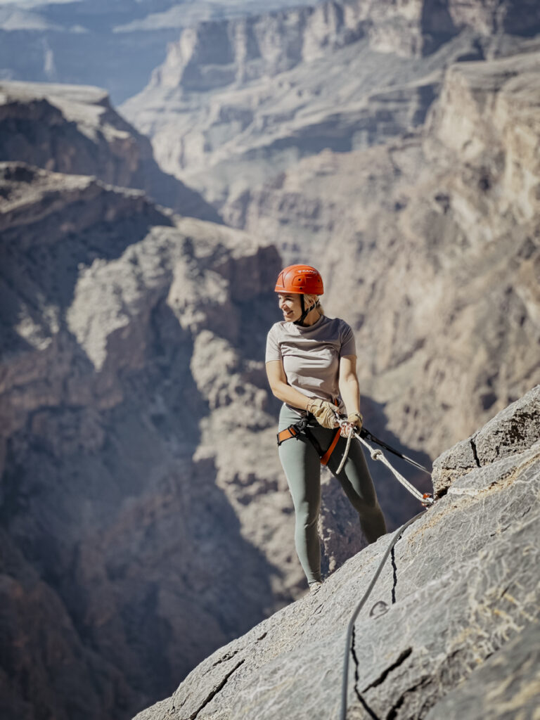 Weiter geht es hoch hinauf – ins Alila Jabal Akhdar (mehr im Blog). Allein die Anfahrt über die Serpentinen der Hajar-Berge ist ein Erlebnis. Auf über 2.000 Metern Höhe thront das Resort wie eine Festung über der Schlucht – ein Ort der Einkehr, des Staunens, des Rückzugs. Morgens schweift der Blick über Felsterrassen und Granatapfelbäume, abends flackert das Feuer auf der Terrasse. Die Klettersteigtour entlang der Canyonwände war ein unvergessliches Erlebnis – atemberaubend, im wahrsten Sinne des Wortes. Trotz seiner abgeschiedenen Lage ist das Alila wunderbar familienfreundlich – wir gingen auf Spurensuche am Schmetterlingsrundwanderweg, fuhren Mountainbike – ein echtes Abenteuer für unsere Kinder, die mit leuchtenden Augen die Wege entlangdüsten und sich fühlten wie kleine Entdecker im Hochgebirge (es gibt sogar Kindermountainbikes mit Helm zum Ausleihen) oder schubsten sie in den Schaukeln am Abenteuerspielplatz der untergehenden Sonne entgegen.