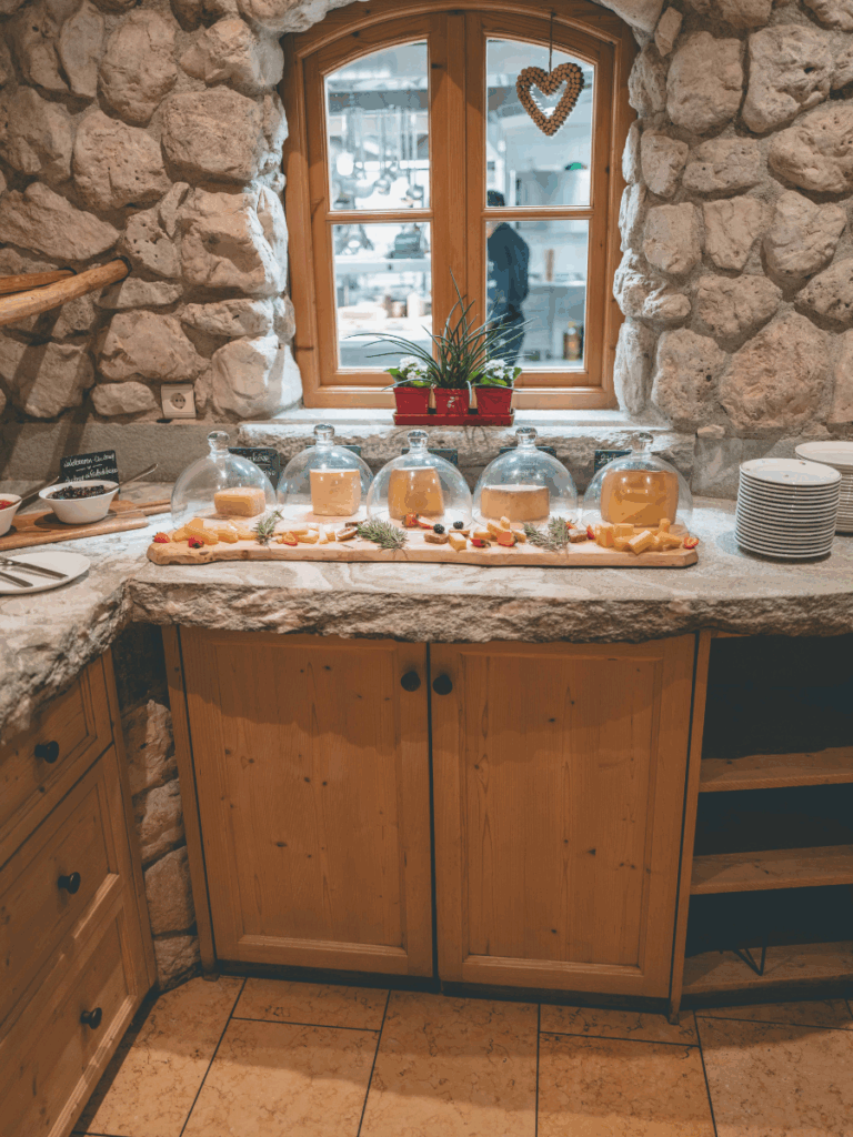 Auch für Aktive ist gesorgt. Der lichtdurchflutete Fitnessraum, das Yoga Shala und die kleine Boulderwand laden dazu ein, Körper und Geist in Balance zu bringen. Natürlich haben wir alles ausprobiert – vom Sonnengruß bis zum Klettergriff. Wer trotzdem noch etwas Natur unter den Füßen spüren möchte, dem sei die Wanderung zur Kreuzwiesenalm empfohlen. Trotz leicht stürmischem Wetter machten wir uns auf den Weg – belohnt wurden wir mit weiten Almwiesen, klaren Gebirgsbächen und hausgemachtem Käse aus der Almkäserei, den es auch abends im Hotel beim Käsebuffet zu entdecken gab.