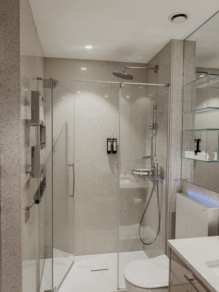 Und dann wäre da noch der Spa, den meine Schwester und ich direkt am ersten Abend ausprobieren dürfen – und das Beste: Es ist ein Private Spa, der nach Verfügbarkeit buchbar und exklusiv nutzbar ist! Bei dem zuvorkommenden Concierge reservieren wir uns direkt eine Stunde Spa-Time, stoßen bei einem Glas Prosecco auf unseren Wochenende-Trip an, genießen das Dampfbad und die finnische Sauna. Auch hier wurde detailverliebt gearbeitet: Die Goldbisazza-Fliesen funkeln an den Wänden, von unseren Entspannungsliegen aus beobachten wir das bläulich leuchtende Aquarium mit bunten Fischen.