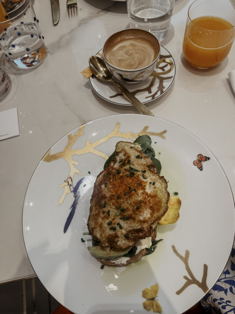 Unseren ersten vollen Tag in Wien beginnen wir in dem kleinen Frühstücksraum des Hotels, der natürlich ebenfalls mit Kunstwerken dekoriert ist – bis ins kleinste Detail: Mundgeblasene Gläser und edles Goldbesteck von Pinti 1929 schmücken hier die Tische. Viel wichtiger als das ist uns natürlich das Frühstück selbst – und weil zu dem Designanspruch des Hauses einfach kein 0815-Frühstücksbuffet passen würde, gibt es das hier auch nicht.