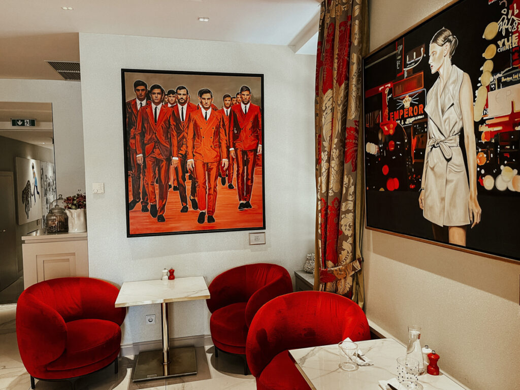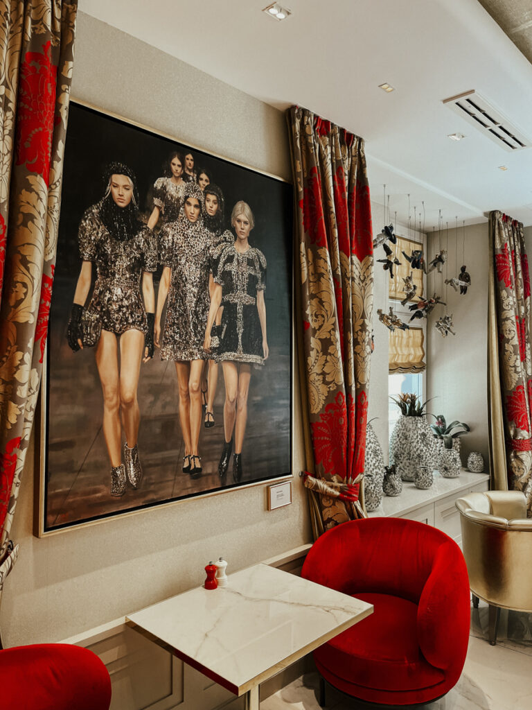 Wenige Schritte weiter, direkt neben der Rezeption empfängt ein eindrucksvolles Gemälde von Attila Adorján die Besucher. Der ungarische Künstler bringt in seinem großformatigen Werk eine Hommage an eine Modeschau des italienischen Labels Dolce&Gabbana auf Leinwand, und so schreiten lebensgroße Models durch die Räume des Kunsthotels. Als ehemalige Modejournalistin erinnere ich mich sofort an die opulente Modenschau aus dem Jahr 2013 der Mailänder Designer, die darin ihre Liebe zur sizilianischen Handwerkskunst und Kultur mit aufwendigen Designs in tiefem Rot und Gold zelebrierten – Farben, die sich auch im Designkonzept des Hotels wiederfinden.