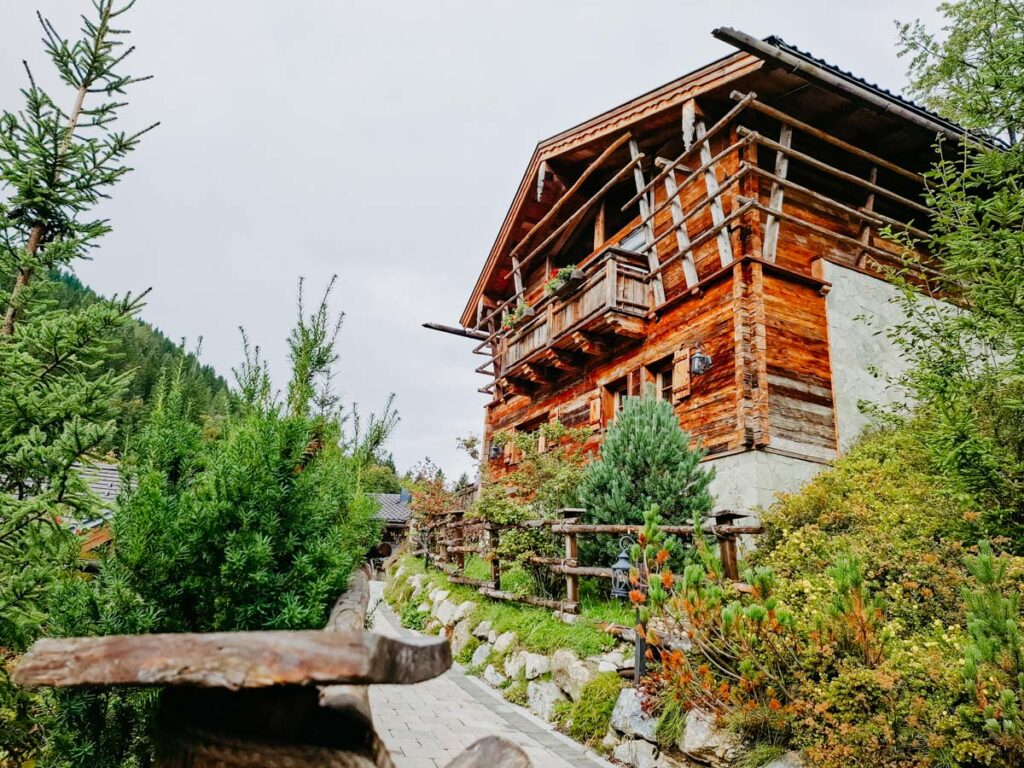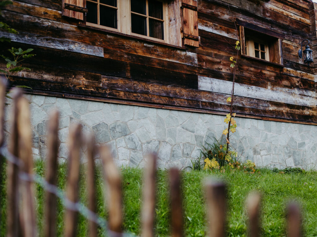 Meine „Mimi“ parkt in der Garage unter der „Prechtlstube“, dem Restaurant des Bergdorfes. Bereits beim Einchecken spürt man, wie die Zeit hier einen Takt langsamer schlägt. An der Rezeption empfängt uns Carina, die Hausherrin, mit einem herzlichen „Grias enk“. Wir folgen Sebastian den gepflasterten Weg hinauf zu unserer Alpen-Luxus-Lodge. Acht schmucke Holzchalets verteilen sich hier am Hang auf 9.000 m² und bieten eine seltene Mischung aus Privatsphäre und Geborgenheit. „Wir haben dafür aus ganz Österreich Altholz zusammengetragen“, erzählt uns Sebastian. Das „Prechtlgut“ wurde 2018 errichtet.