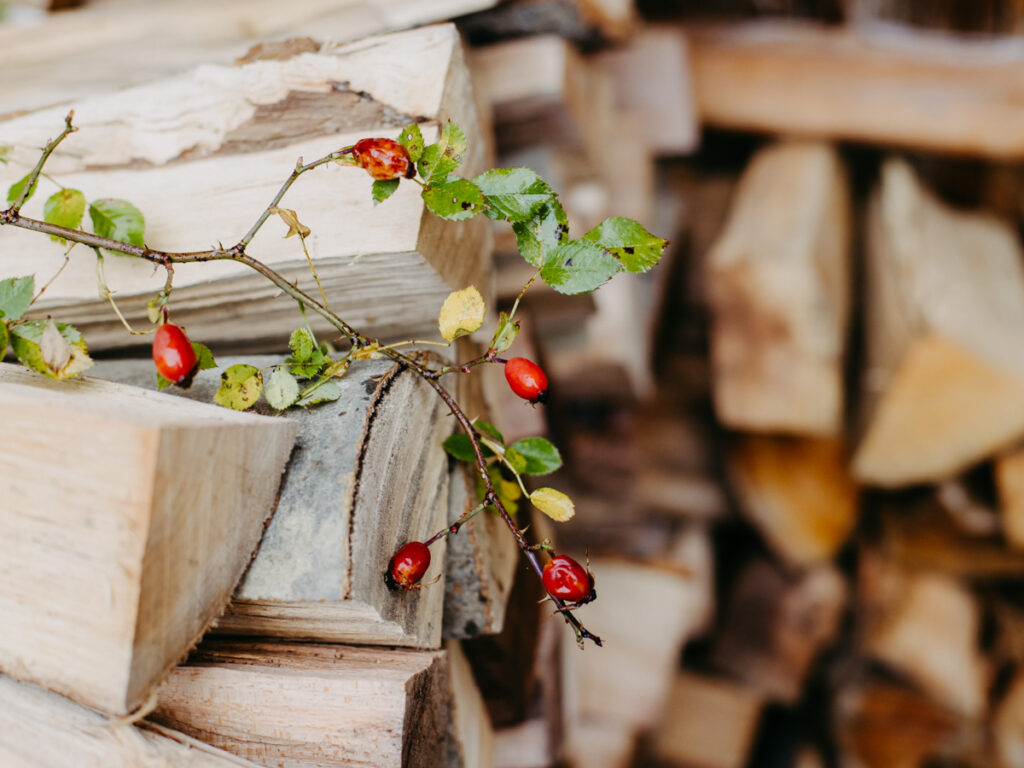 In der gut ausgestatteten Zirbenholzküche findet man alles was man braucht, um sich und seine Liebsten kulinarisch zu verwöhnen. Einen gut bestückten Weinklimaschrank, eine Jura-Kaffeemaschine und viel schönes Geschirr. Ein Korb mit Obst und eine Flasche frisches Quellwasser sagen uns „Willkommen!“. Schau mal, dort oben gibt’s auch noch etwas zu entdecken“, ruft Elke und klettert die schmale Holzleiter hinauf insJuche. Eine kleine Höhle mit einer Kuschelliege verbirgt sich direkt unter den Holzbalken des Daches. Wir öffnen die Balkontüre. Frische Bergluft weht herein und der Herbst hat die Hänge gegenüber in goldene Farben getaucht.