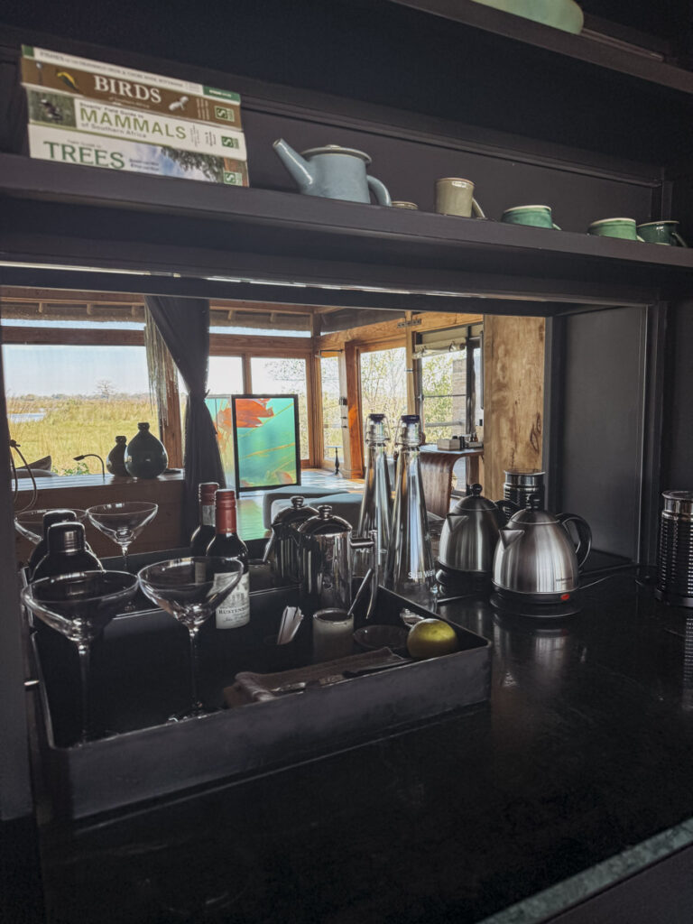 Die reduzierte Architektur fügt sich organisch in die Umgebung ein – und ist dabei überraschend luxuriös. Holzstege verbinden die offenen Lounge-Bereiche mit den Gästezelten, dazwischen wiegt sich das Schilf. Ich entdecke die Feuerstelle und weiß sofort: Das wird unser Lieblingsplatz unter dem Sternenhimmel! Die Bar gibt den Blick über die Wasserlandschaft frei. Egal, wohin wir blicken – die Natur spielt die Hauptrolle. Und wir? Wir sitzen bei Kaffee und süßem Gebäck auf der Terrasse, als plötzlich ein einzelner Elefant wie aus dem Nichts auftaucht. Er stapft durch das Wasser und bewegt sich langsam und würdevoll direkt auf uns zu. Nur wenige Meter trennen uns. Wir sagen kein Wort. Die Nachmittagssonne färbt das Wasser golden. Und dann ist er wieder verschwunden – als wäre nichts gewesen. Nur unser Herz schlägt ziemlich schnell. Denn mit so einem aufregenden Moment hatten wir gleich zum Auftakt nicht gerechnet.
