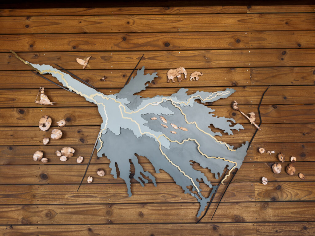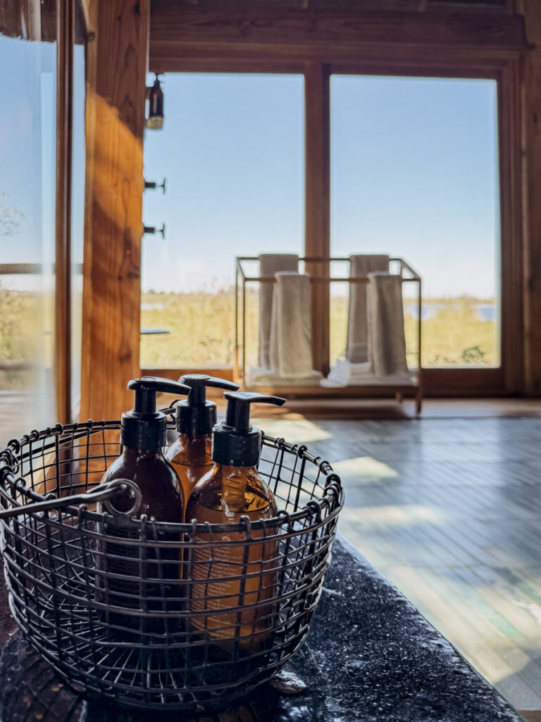 Zelt ist untertrieben, denn unsere Suite ist ein einzigartiges Erlebnis zwischen Grenzenlosigkeit und Geborgenheit. Das hochwertige Interieur ist aus natürlichen Materialien gefertigt. Farben, die sich zurücknehmen – und dabei doch voller Leben sind. Auf den Fronten der Möbel schimmern Muster in Türkis, Sand und Moosgrün, die an die Unterwasserwelt des Deltas erinnern. Die Natur fließt hier in den weiten, lichtdurchfluteten Innenraum hinein – eine stille Hommage an das, was draußen geschieht.