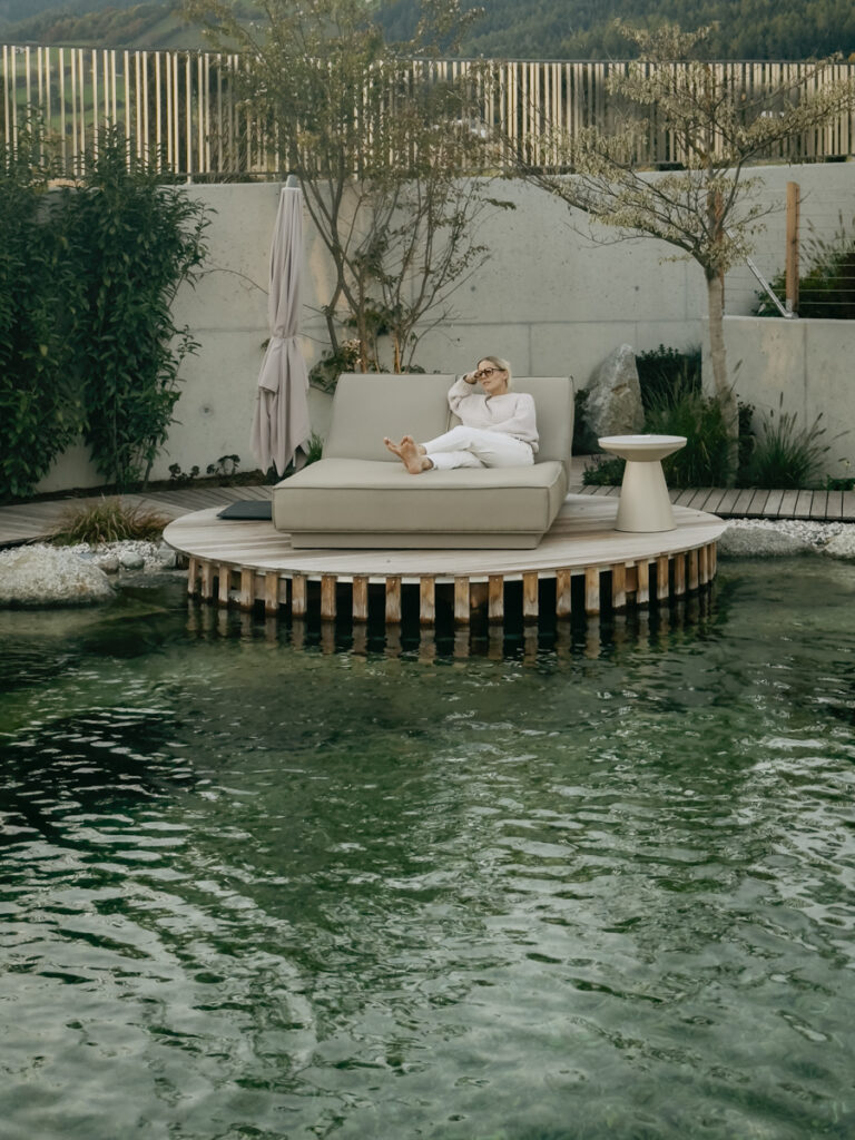Unser Mini-Urlaub beginnt mit einem Drink auf der sonnigen Terrasse. Loungemöbel in gedeckten Tönen bilden einen wunderschönen Kontrast zu den satten Farben des üppig bepflanzten Gartens. Mit einer Kreation aus Tequila, Limettensaft, Basilikum und Olivenöl stoßen wir an. Weil der Alkohol schnell zu Kopf steigt, sind wir froh um die köstlichen Speckbrote, die dazu gereicht werden. Am Nebentisch wird gerade eine herrlich duftende Pizza serviert, denn Freitag und Samstag ist ein neapolitanischer Pizzabäcker im Haus. Erfrischt genießen wir den Blick auf die weitläufige Gartenlandschaft. Die 5000 m2 Oase verläuft auf drei Seiten hinter dem Hauptgebäude und ist zum Panorama der Dolomiten hin orientiert. Ein beheizter Infinity Pool, der kristallklare Naturbadeteich sowie die Yogaplattformen und großzügigen Liegebereiche machen deutlich, dass der Garten als integraler Teil des SPA Erlebnisses konzipiert ist. Licht, Landschaft und Architektur bilden die Kulisse, die den Wohlfühlfaktor ausmachen.