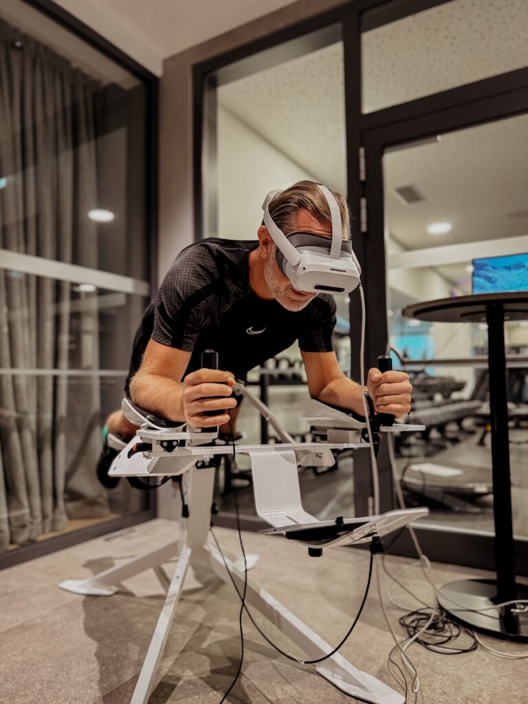 Wir durften den Icaros ausprobieren, ein futuristisches Trainingsgerät, bei dem man mit Virtual Reality Brille (unter anderem) einen unglaublich realistischen Wing-Suit-Flug machen kann, bei dem man vergisst, dass man sich viele Minuten in der Plank befindet. Zum Glück haben wir keine Höhenangst. Das Ganze ist sehr realistisch und wirklich beeindruckend.