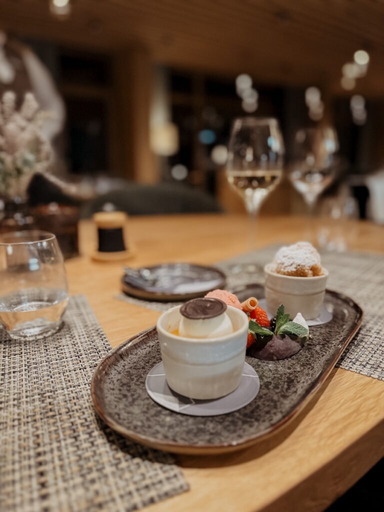 Mittags und abends verwöhnt uns das Küchenteam mit einem alpin-mediterranen Konzept, verfeinert mit asiatischen Einflüssen. Die Zutaten stammen vorwiegend aus der Region, serviert wird mit Liebe zum Detail und begleitet von einem Panoramablick, der seinesgleichen sucht. Eine beindruckend gemütliche Bar und die großzügige Terrasse laden zum Verweilen und Genießen ein.