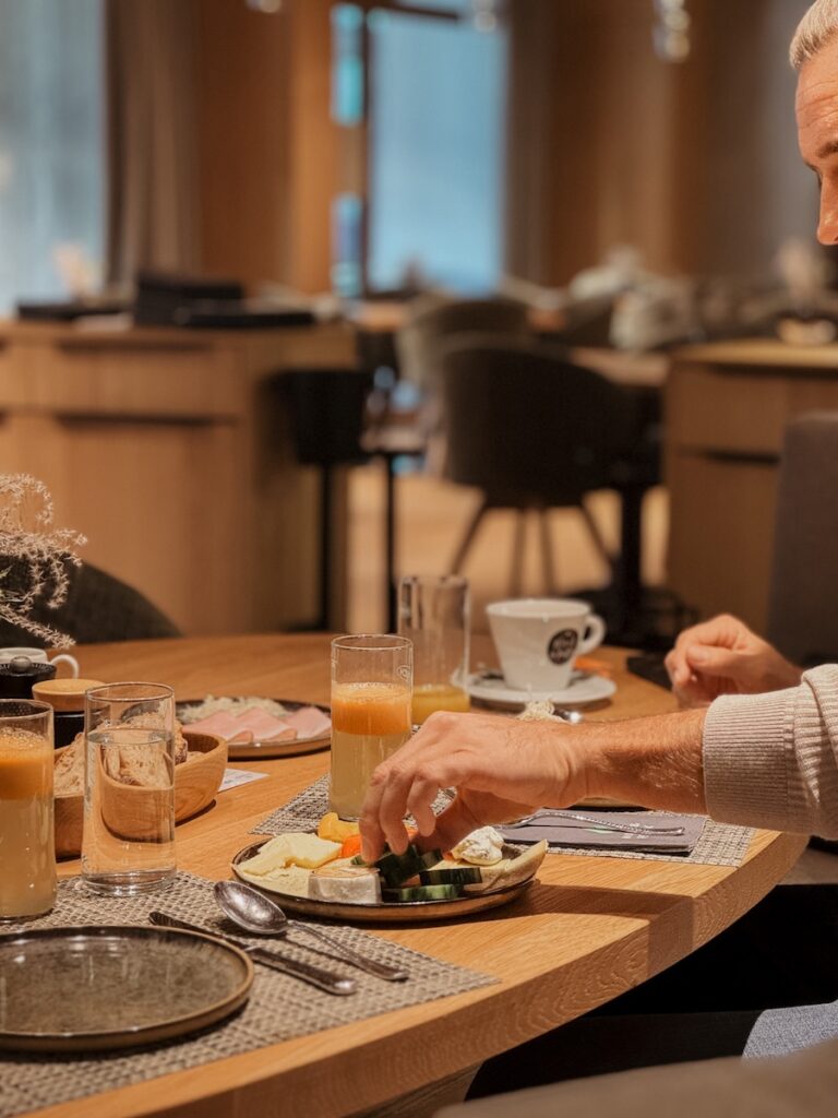 Der Tag beginnt mit einem durchdachten Frühstücksbuffet, frisch, hochwertig und – bei schönem Wetter – auf der Sonnenterrasse mit Blick auf den Walchsee. Wurstwaren und Käse werden frisch aufgeschnitten – wir fühlen uns wie in einem kleinen Feinkostladen. Das führt zum einen dazu, dass Schinken und Käse viel frischer und nicht vertrocknet schmecken und aussehen, zum anderen wird nichts verschwendet. Tolle Idee! Eine Saftpresse lässt uns gleich gesund in den Tag starten, frisches Obst und eine Auswahl an Eigerichten geben uns Kraft für den „Move-Teil“ des Tages.