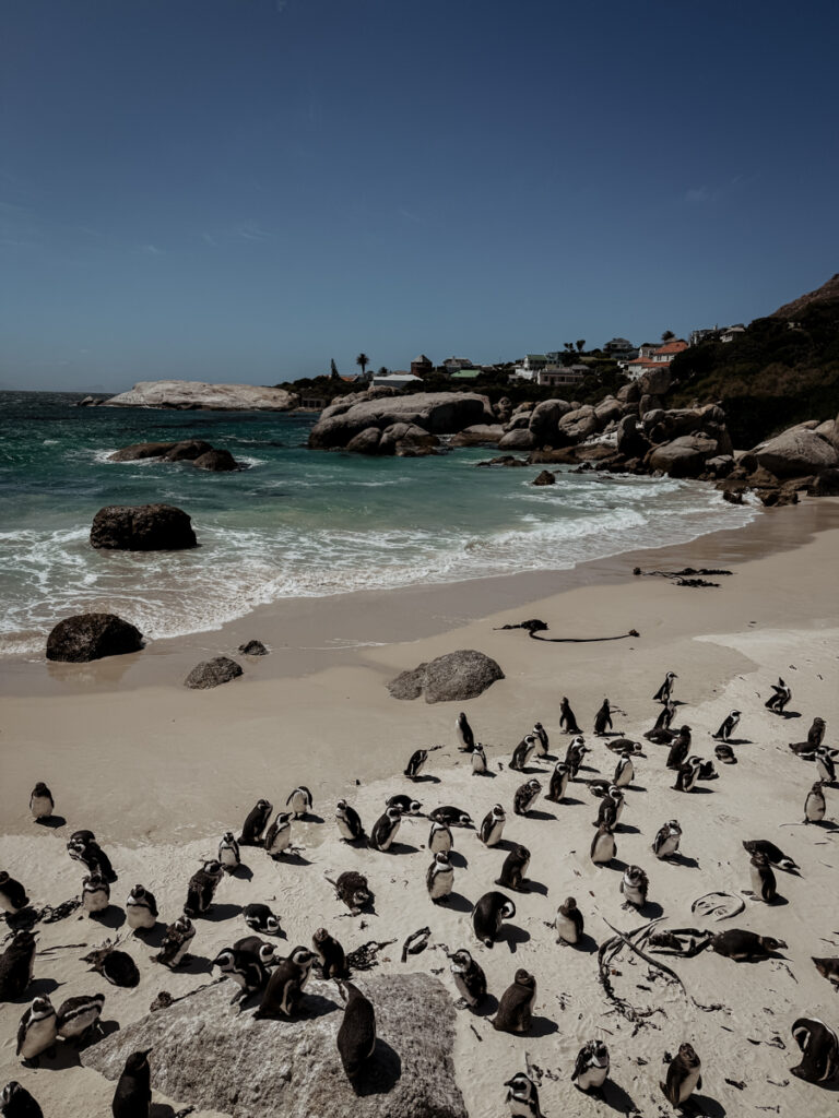 Unser erstes Ziel ist der Boulders Beach und die Pinguinkolonie, die dort lebt. Wir beobachten die tapsigen Tiere, wie sie unbeirrt zwischen den Felsen watscheln, ins Wasser tauchen, sich gegenseitig putzen. Einige von ihnen schauen noch ziemlich zerzaust aus – Jungtiere, die gerade erst ihre ersten Flaumfedern verlieren. Diese kleinen Wesen voller Stolz und Ungeschicktheit zugleich zu beobachten, lässt unser Herz aufgehen. Ihre kleinen Geräusche, das Plätschern der Wellen, das Kreischen der Möwen – alles zusammen wirkt wie ein kleines, perfektes Naturkonzert.