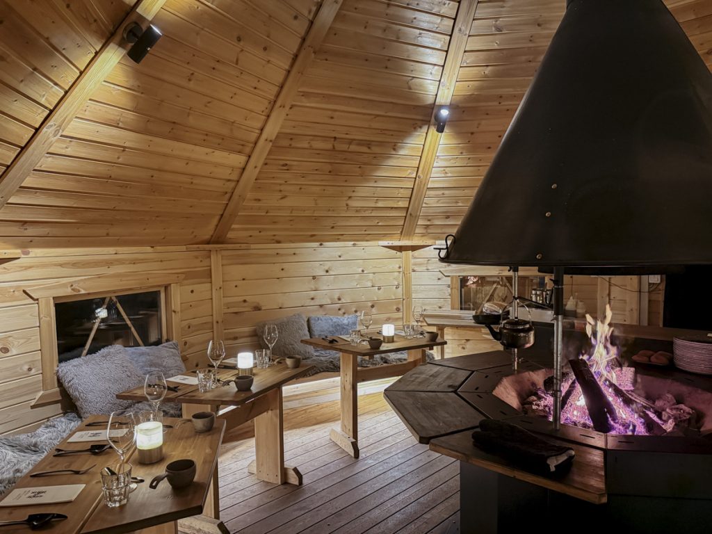 ✔️ Dinner am offenen Feuer: Restaurant-Atmosphäre, wärmend und gesellig nach einem Tag im Schnee