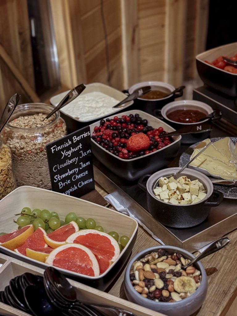 Draußen liegt der Schnee glatt und makellos, und am Panoramafenster zeigt sich das erste, blasse Licht über dem gefrorenen Fluss. Halb verschlafen bleiben wir noch einen Moment im Bett sitzen und schauen hinaus – als würde Lappland den Tag ganz langsam öffnen. Ich stapfe nach draußen, um frische Luft zu schnappen, strecke mich und atme einmal tief durch, bevor es uns Restaurant zieht. Dort planen wir beim Frühstück, worauf wir Lust haben – Schneemobil, Huskys oder ein einfacher Spaziergang?