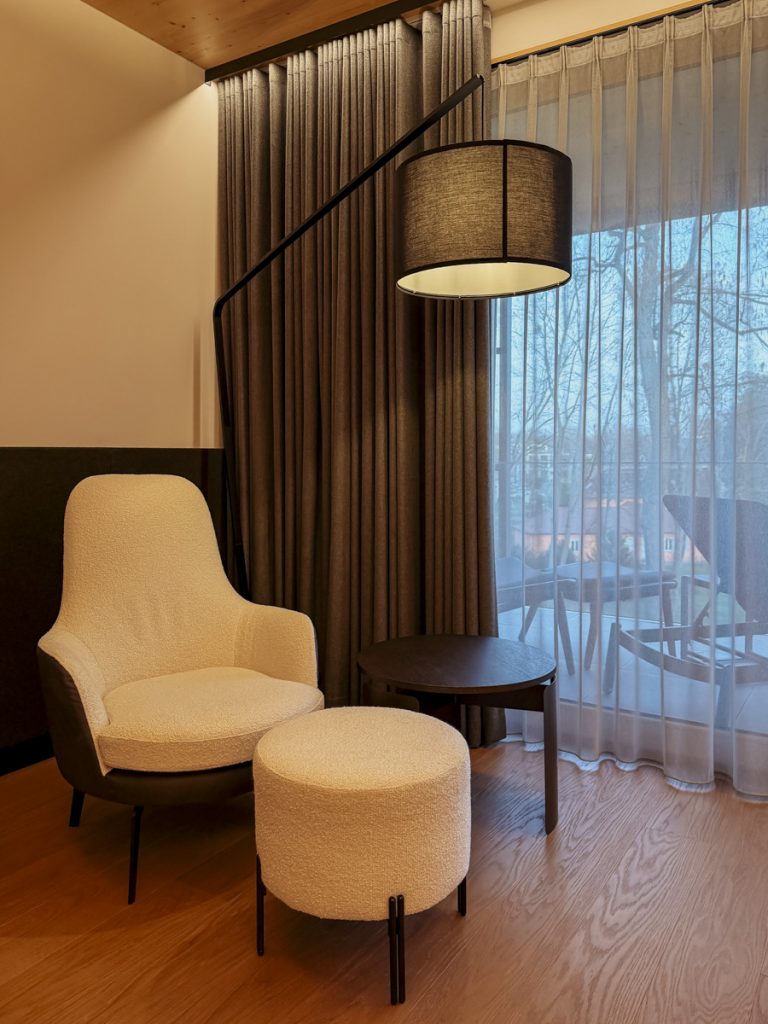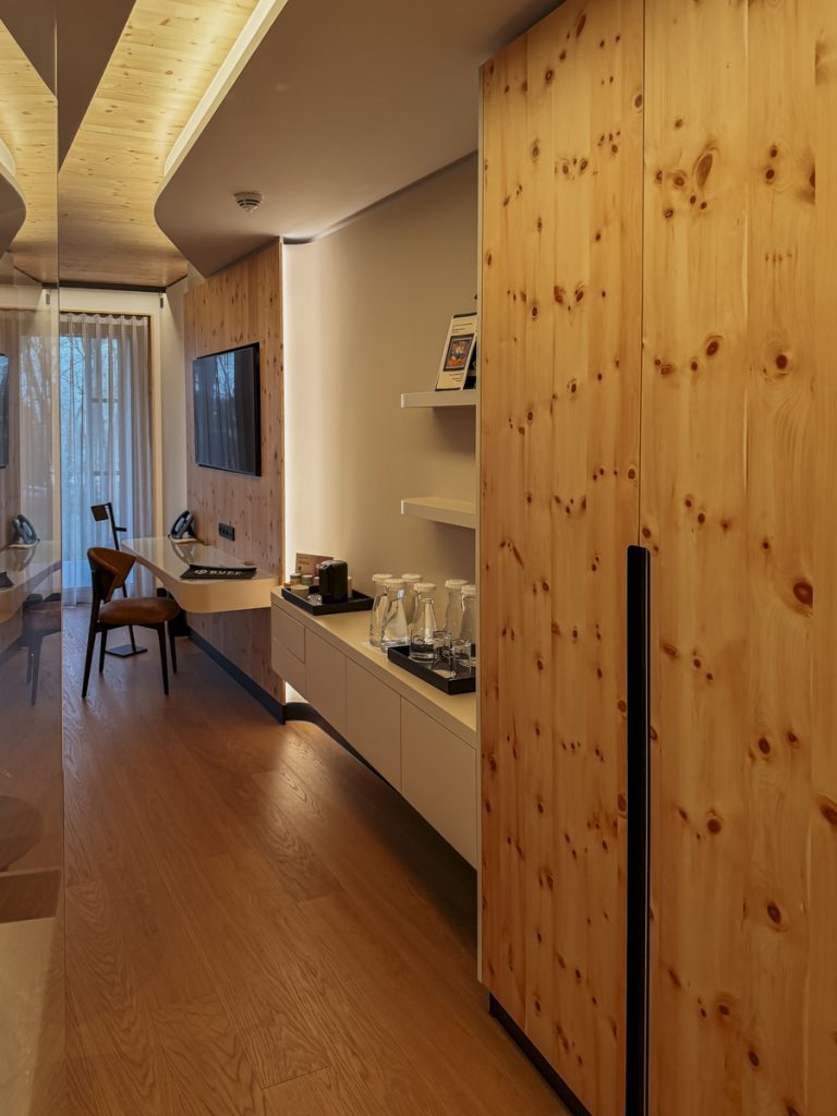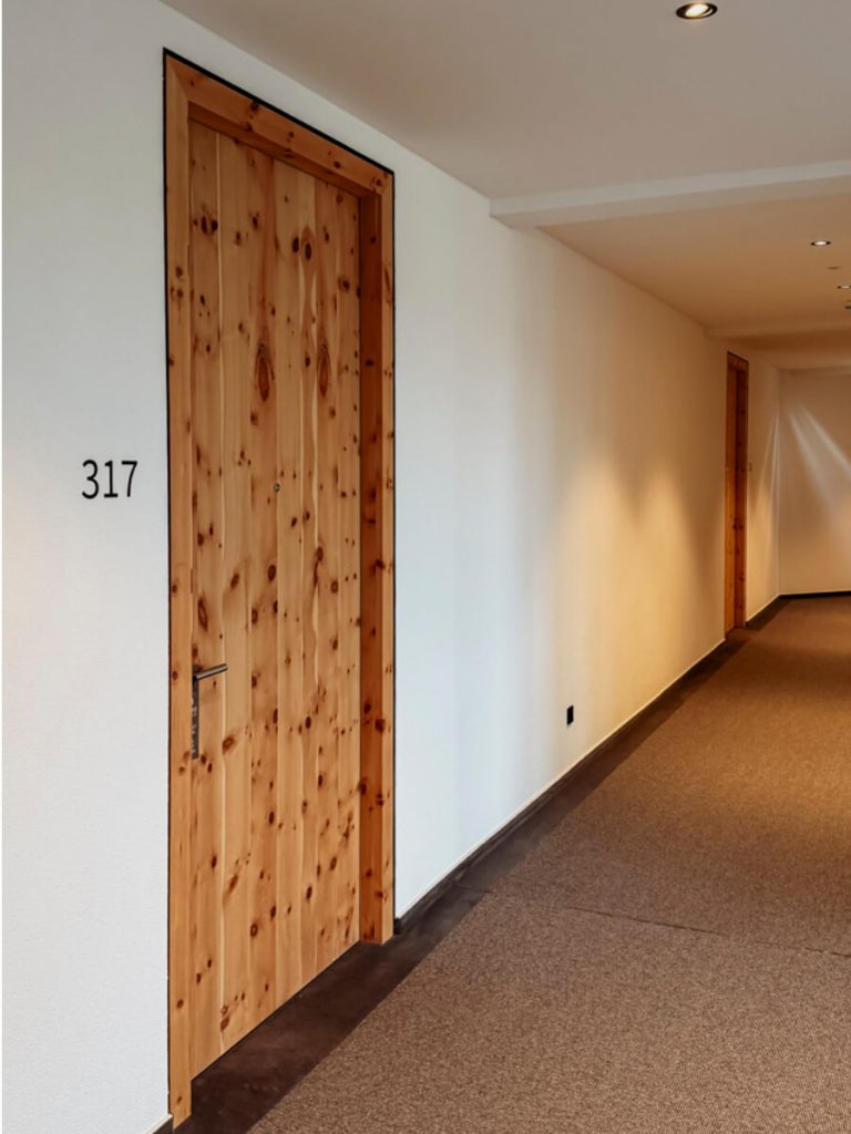 Die Zimmer sind klar und natürlich eingerichtet. Schweizer Arvenholz an den Wänden – der Duft ist sofort da, warm und harzartig – dazu Lodenstoffe, Naturholzböden, kein Plastik, nichts Künstliches.
