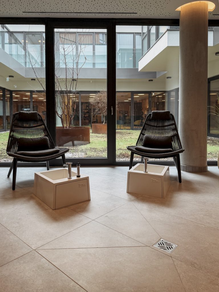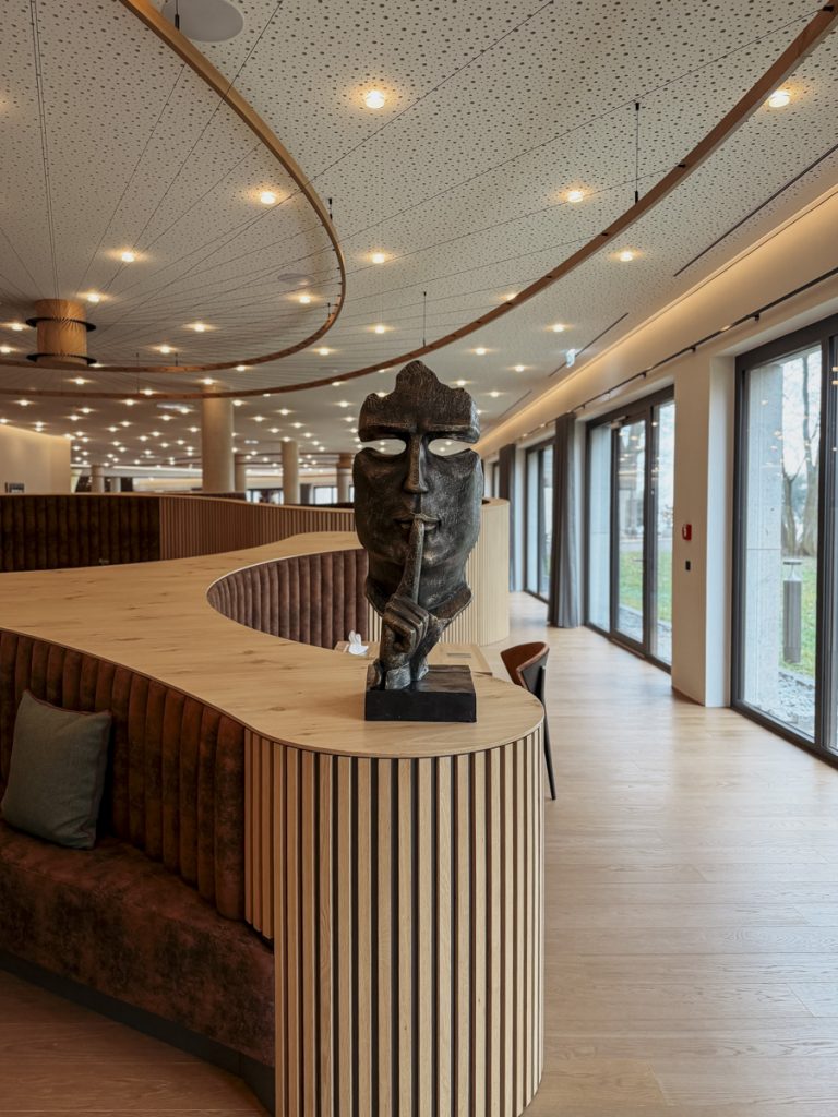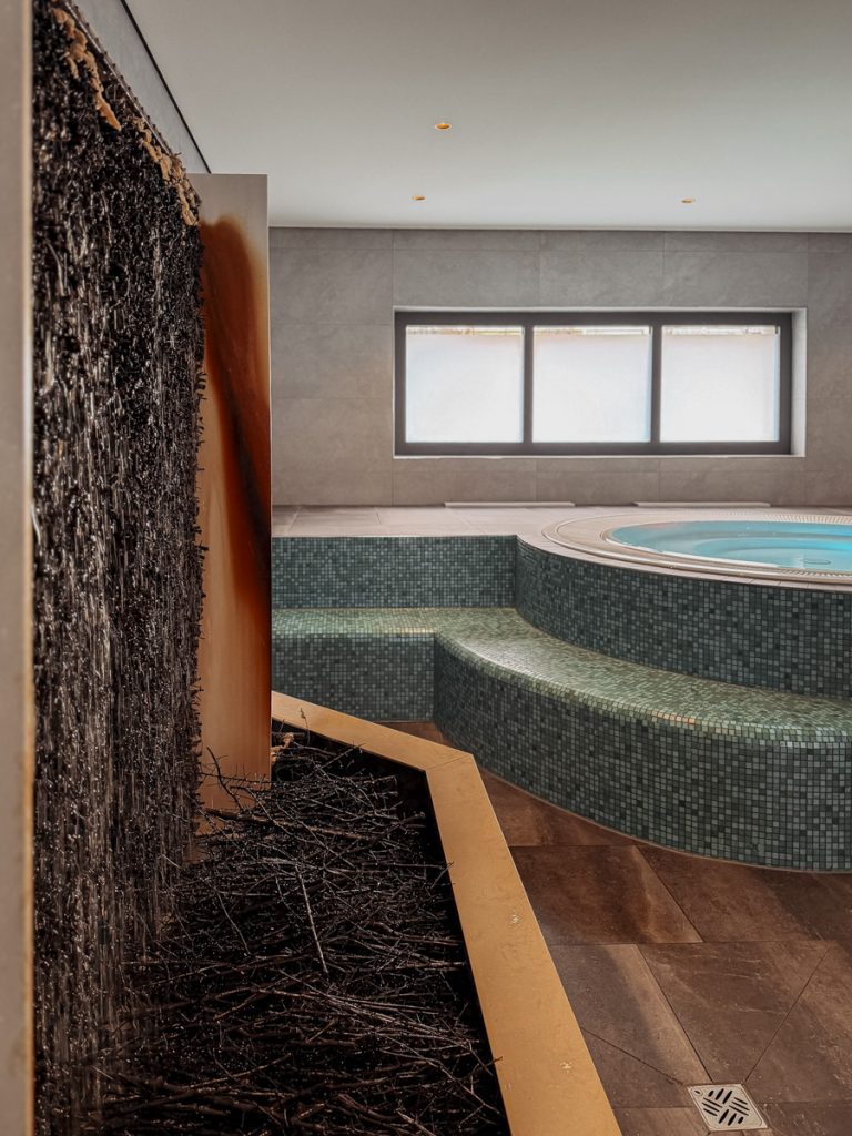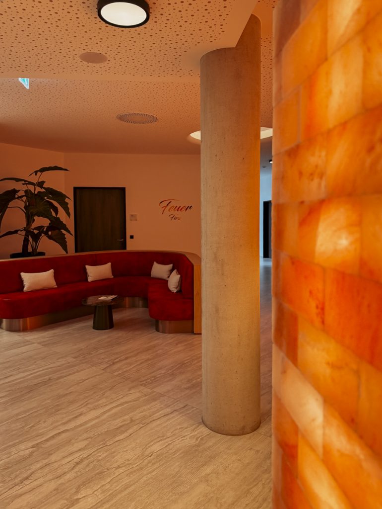 Der Spa-Bereich des Buff Medical Resorts ist keine Dekoration – er ist Programm. Das Gradierwerk, ein Sole-Freiluftinhalatorium aus aufgeschichtetem Schwarzdornreisig, erzeugt ein Mikroklima, das wohltuend auf die Atemwege wirkt. Einfach davorstehen, tief einatmen, ankommen. Das haben wir beide gebraucht.