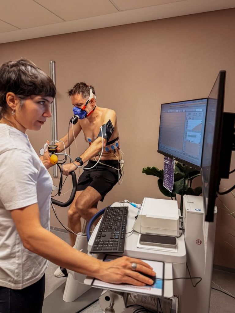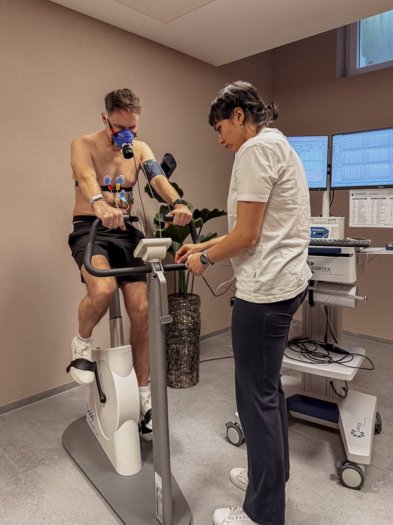 Danach: die lang ersehnte Spiroergometrie. Thomas war gespannt wie selten. Beim Test – durchgeführt auf einem Cardio-Gerät mit Messmaske – wird ermittelt, welches Sauerstoffvolumen der Körper unter maximaler Belastung aufnehmen und verarbeiten kann.