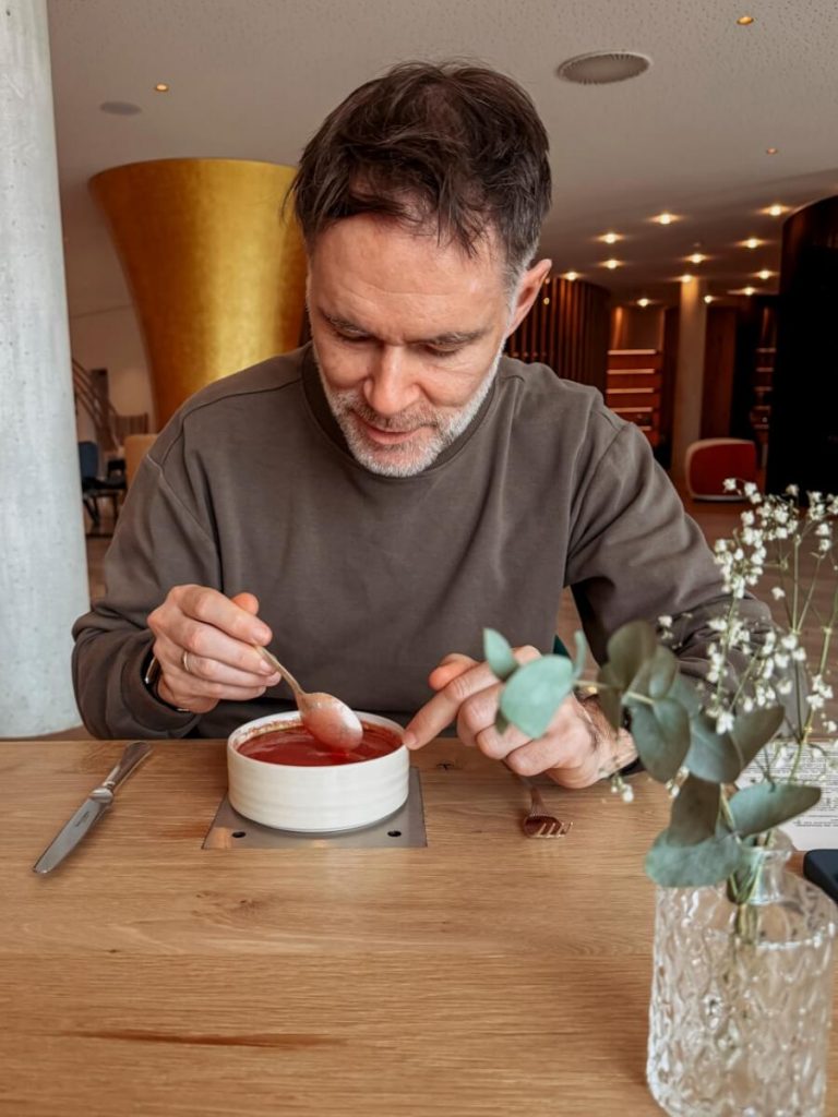 Wir waren ehrlich gesagt etwas nervös vor unserem ersten Abendessen. Wir wussten, dass wir uns hier kulinarisch auf neues Terrain begeben würden: Keine Menüfolge wie gewohnt, kein Wein, kein Kaffee. Die „Longevity Cuisine“ nach F.X. Mayr stellt den Darm in den Mittelpunkt – und die Art, wie wir essen, mindestens genauso wie das, was wir essen.
