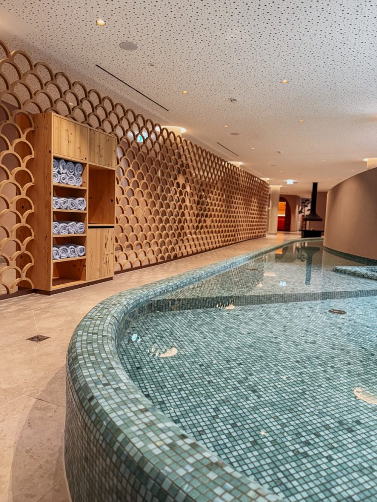 Der Pool – und das ist kein gewöhnlicher Hotelpool – misst 40 Meter in der Länge. 15 Meter indoor, Türe auf, 25 Meter weiter. Für Olivia als ehemalige Leistungsschwimmerin ein kleines Highlight: ein echter Trainingspool, nicht ein Planschbecken. Für ein Haus mit maximal 150 Gästen.
